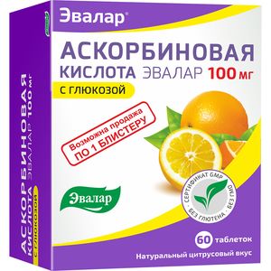 Аскорбиновая кислота 100 мгТаблетки с натуральным цитрусовым вкусом. Разрешена детям с 3-х лет, беременным и кормящим женщинам.Активное вещество: аскорбиновая кислота (витамин С).Действие: для восполнения дефицита витамина С в организме.Аскорбиновую кислоту, как аналог натурального витамина С, получили швейцарские ученые в 1933 году, а назвали ее так за способность бороться с цингой, которую в старину называли «скорбут». Витамин С рекомендуется употреблять как во время простуды, так и для профилактики различных вирусных инфекций, поэтому прием аскорбиновой кислоты особенно актуален в осенне-зимний период для поддержания организма.Согласно статистическим данным, обнародованным ВОЗ (Всемирной организацией здравоохранения), недостаток в витамине С испытывает почти 95 % жителей нашей планеты. А у 20–25% россиян уровень витамина С в организме ниже нормы даже летом.Витамин С, жизненно необходимый человеку, не синтезируется организмом самостоятельно. Именно поэтому важно, чтобы он поступал в достаточном количестве из внешних источников. Его можно получать из продуктов питания или биологически активных добавок. Аскорбиновая кислота (витамин С) принимает активное участие практически во всех процессах жизнедеятельности. Ее дефицит приводит к ослаблению иммунной системы, поэтому человек чаще подвергается простудным заболеваниям.Аскорбиновая кислота: способствует укреплению иммунной системы, повышает устойчивость организма к бактериальным и вирусным инфекциям, сопротивляемость к интоксикациям химическими веществами, перегреванию, охлаждению, кислородному голоданию, являясь антиоксидантом, предохраняет мембраны клеток и, в частности, лимфоцитов от повреждающего действия перекисного окисления (иммуностимулирующий эффект), стимулирует рост, участвует в окислительных процессах, тканевом дыхании, обмене аминокислот, улучшает использование углеводов и нормализует обмен холестерина, стимулирует деятельность эндокринных желез, особенно надпочечников, улучшает функцию печени, способствует усвоению железа и нормальному кроветворению, влияет на обмен многих витаминов.Аскорбиновую кислоту Эвалар в форме жевательных таблеток с натуральным цитрусовым вкусом можно принимать как дополнительный источник витамина С. Она легко усваивается организмом: вещество, растворяясь уже в полости рта, быстрее попадает в кровь и проникает в клетки. Рекомендуется не только взрослым, но и детям с 3 лет, беременным и кормящим женщинам.