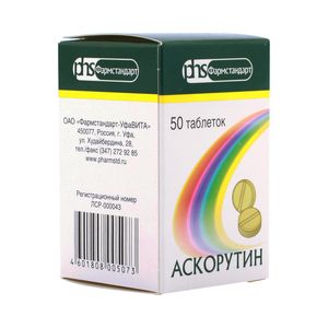 Аскорутин ,витамин, содержащий аскорбиновую кислоту и рутозид. Аскорбиновая кислота участвует в регуляции окислительно-восстановительных процессов, углеводного обмена, свертываемости крови, регенерации тканей, способствует повышению сопротивляемости организма.Рутозид устраняет повышенную проницаемость капилляров, укрепляет сосудистую стенку, уменьшая ее отечность и воспаление. Обладает антиагрегантным действием, что способствует улучшению микроциркуляции.Аскорутин применяют в комплексной терапии при варикозном расширении вен, трофических нарушениях и язвах кожи, при хронической венозной недостаточности и при геморрагическом диатезе. Таблетки можно принимать как во время, так и после приема пищи.Отпускается без рецепта.