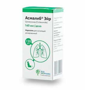 Характеристика препарата:Действующее вещество препарата Асмалиб® Эйр — циклесонид. Циклесонид относится к фармакологической группе глюкокортикостероиды (для снижения воспаления). Циклесонид оказывает противовоспалительное действие на дыхательные пути, это приводит к ослаблению проявлений бронхиальной астмы. Применение препарата Асмалиб® Эйр приводит к облегчению дыхания, снижению риска обострения бронхиальной астмы. Эффект препарата Асмалиб® Эйр развивается постепенно.Препарат Асмалиб® Эйр не подходит для неотложной помощи при приступе одышки, в такой ситуации необходимо использовать препарат для снятия симптомов бронхиальной астмы (бронходилататор) быстрого действия (например, сальбутамол).