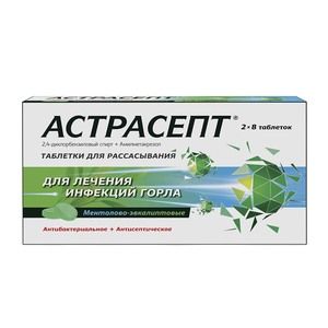 Астрасепт это комбинированный противомикробный препарат для лечения болезней горла. Обладает антисептическим действием, рекомендован для взрослых и детей старше 5 лет. Активен в отношении грамположительных и грамотрицательных микроорганизмов.Таблетки для рассасывания обычные: круглые двояковыпуклые таблетки вишнево-красного цвета.Таблетки для рассасывания лимонные: круглые двояковыпуклые таблетки желтого цвета.Таблетки для рассасывания апельсиновые: круглые двояковыпуклые таблетки оранжевого цвета.Таблетки для рассасывания имбирно-лимонные: круглые двояковыпуклые таблетки оранжевого цвета с коричневатым оттенком.Таблетки для рассасывания медово-лимонные: круглые двояковыпуклые таблетки от светло-желтого до желто-коричневого цвета.Таблетки для рассасывания ментолово-эвкалиптовые: круглые двояковыпуклые таблетки зеленого цвета.Допускается неравномерность окрашивания, наличие пузырьков воздуха в карамельной массе и незначительная неровность краев.