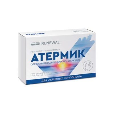 Фармакологическое действие Комбинированное лекарственное средство, содержащее ибупрофен (НПВС) и парацетамол (анальгетик-антипиретик). Ибупрофен оказывает анальгезирующее, противовоспалительное, жаропонижающее действие. Угнетая ЦОГ-1 и ЦОГ-2, нарушает метаболизм арахидоновой кислоты, уменьшает количество простагландинов (медиаторов боли, воспаления и гипертермической реакции), как в очаге воспаления, так и в здоровых тканях, подавляет экссудативную и пролиферативную фазы воспаления. Парацетамол неизбирательно блокирует ЦОГ, преимущественно в ЦНС, слабо влияет на водно-солевой обмен и слизистую оболочку ЖКТ. Оказывает анальгезирующее и жаропонижающее действие. В воспаленных тканях пероксидазы нейтрализуют влияние парацетамола на ЦОГ-1 и ЦОГ-2, что объясняет низкий противовоспалительный эффект. Показания активных веществ препарата Атермик Для взрослых: болевой синдром средней интенсивности; травматическое воспаление мягких тканей и опорно-двигательного аппарата (в т.ч. ушибы, растяжения, вывихи, переломы); послеоперационный период; альгодисменорея; зубная боль; невралгия; миалгия; люмбаго; фиброзит; тендовагинит; головная боль; лихорадочный синдром; суставной синдром (ревматоидный артрит, остеоартроз, анкилозирующий спондилоартрит, подагрический артрит); синусит; тонзиллит. Для детей (в качестве вспомогательного лекарственного средства): тонзиллит; острые инфекционно-воспалительные заболевания верхних отделов дыхательных путей (фарингит, трахеит, ларингит).