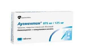 Показания к применениюБактериальные инфекции, вызванные чувствительными к препарату микроорганизмами:Инфекции верхних дыхательных путей и ЛОР-органов (например, рецидивирующий тонзиллит, синусит, средний отит), обычно вызываемые Streptococcus pneumoniae, Haemophilus influenzae*, Moraxella catarrhalis*, Streptococcus pyogenes.Инфекции нижних отделов дыхательных путей: обострения хронического бронхита, долевая пневмония и бронхопневмония, обычно вызываемые Streptococcus pneumoniae, Haemophilus influenzae* и Moraxella catarrhalis* (кроме таблеток 250 мг/125 мг).Инфекции мочеполового тракта: цистит, уретрит, пиелонефрит, инфекции женских половых органов, обычно вызываемые видами семейства Enterobacteriaceae (преимущественно Escherichia coli*), Staphylococcus saprophyticus и видами рода Enterococcus.Гонорея, вызываемая Neisseria gonorrhoeae* (кроме таблеток 250 мг/125 мг).Инфекции кожи и мягких тканей, обычно вызываемые Staphylococcus aureus*, Streptococcus pyogenes и видами рода Bacteroides*.Инфекции костей и суставов: остеомиелит, обычно вызываемый Staphylococcus aureus*, при необходимости проведения длительной терапии.Одонтогенные инфекции, например, периодонтит, верхнечелюстной синусит, тяжелые дентальные абсцессы с распространяющимся целлюлитом (для таблеток 500 мг/125 мг или 875 мг/125 мг).Другие смешанные инфекции (например, септический аборт, послеродовый сепсис, интраабдоминальный сепсис) в рамках ступенчатой терапии (для таблеток 250 мг/125 мг или 500 мг/125 мг, или 875 мг/125 мг).* отдельные представители указанного рода микроорганизмов, продуцируют β-лактамазу, что делает их нечувствительными к амоксициллину.Инфекции, вызванные чувствительными к амоксициллину микроорганизмами, можно лечить препаратом Аугментин, поскольку амоксициллин является одним из его активных ингредиентов. Препарат Аугментин также показан для лечения смешанных инфекций, обусловленных микроорганизмами, чувствительными к амоксициллину, а также микроорганизмами, продуцирующими β-лактамазу, чувствительными к комбинации амоксициллина с клавулановой кислотой.Чувствительность бактерий к комбинации амоксициллина с клавулановой кислотой варьируется в зависимости от региона и с течением времени. Там, где это возможно, должны быть приняты во внимание локальные данные по чувствительности. В случае необходимости следует проводить сбор микробиологических образцов и анализ на бактериологическую чувствительность.СоставВ 1 таблетке содержится: Действующие вещества: амоксициллин (в форме тригидрата) — 875 мг, клавулановая кислота (в форме калиевой соли) — 125 мг. Вспомогательные вещества: магния стеарат — 14,5 мг, карбоксиметилкрахмал натрия — 29 мг, кремния диоксид коллоидный — 10 мг, целлюлоза микрокристаллическая — 396,5 мг. Состав пленочной оболочки: титана диоксид — 13,76 мг, гипромеллоза (5 cps) — 10,56 мг, гипромеллоза (15 cps) — 3,52 мг, макрогол 4000 — 2,08 мг, макрогол 6000 — 2,08 мг, диметикон — 0,013 мг.