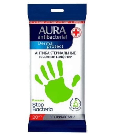 AURA Влажные салфетки антибактериальные Derma Protect РОМАШКА pocket-pack 20шт КК/48Внешний вид: Вискозная салфетка белого цвета с травянистым запахом.Специальные особенности: Дополнительная защита от бактерийОписание и свойства: Влажные антибактериальные салфетки AURA Derma Protect идеально подходят для очищения кожи рук, обеспечивая пролонгированную защиту от бактерий до 12 часов.Инновационный антибактериальный комплекс, входящий в состав лосьона, содержит в себе биоразгагаемый компонент Salibact®, который бережно защищает кожу от бактерий и грибов. Натуральные компоненты — масло тимьяна и чайного дерева уменьшают раздражение кожи и обладают противовоспалительными свойствами.Антибактериальная эффективность подтверждена протоколами испытаний. Салфетки клинически и микробиологически протестированы.Продукция поддерживается Российским Красным Крестом.Упаковку карманного формата удобно взять с собой.Результат: Чистые руки, дополнительная защита от бактерий