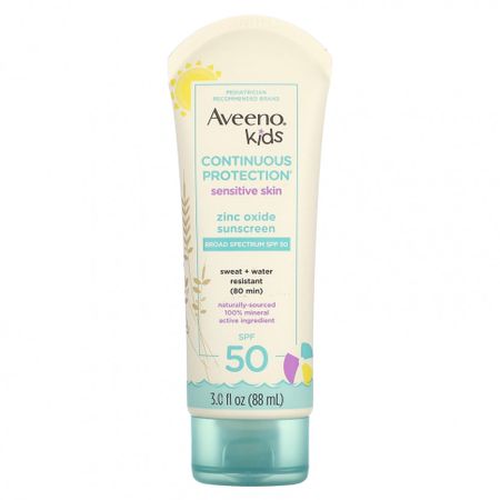 Описание Бренд, рекомендованный педиатрами Широкий спектр защиты с SPF 50Устойчивый к поту и водостойкий (80 минут)100% минеральный активный ингредиент из натуральных источниковЗащита от солнца для активного отдыха вашего ребенка. Для детей всех возрастов лосьон для чувствительной кожи Aveeno® Kids Continuous Protection® обеспечивает широкий спектр защиты и водостойкий и водостойкий в течение 80 минут. Он также содержит безопасные для чувствительной кожи ингредиенты, такие как оксид цинка натурального происхождения и успокаивающий кожу овес.Не оставляет ощущения жирности Не содержит парабенов Без фталатов Без отдушки Гипоаллергенный продукт Без слезTSA подходит для путешествийНазначение. Помогает предотвратить возникновение солнечных ожогов. Рекомендации по применению Нанесите обильное количество средства за 15 минут до выхода на солнцеПовторное нанесение Через 80 минут плавания или при сильном потоотделенииСразу после вытирания полотенцемКаждые 2 часа или чащеМеры по защите от солнца. Пребывание на солнце увеличивает риск развития рака кожи и ее преждевременного старения. Для снижения этого риска регулярно используйте солнцезащитный крем широкого спектра защиты с фактором защиты SPF от 15 или выше и другие меры защиты от солнца, в том числе указанные ниже. Ограничивайте время, проводимое на солнце, особенно в период с 10 до 14 часов.Носите одежду с длинными рукавами, брюки, головные уборы и солнцезащитные очкиДети в возрасте до 6 месяцев: необходимо проконсультироваться с врачом Ингредиенты Сведения о действующих веществахАктивные ингредиентыНазначениеОксид цинка 21,6%Солнцезащитное средство Вспомогательные ингредиентыВода, C12-15-алкилбензоат, сополимер стирола / акрилатов, кроссполимер октилдодецилцитрата, фенилтриметикон, цетил ПЭГ / ППГ-10/1 диметикон, диметикон, полигидроксистеариновая кислота, глицерин, этилметикон, диоксид кремния, цетилдиметоксиликонат, триэтолцерин бегенат, хлорид натрия, сополимер акрилатов / диметикона, хлорфенезин, фенетиловый спирт, овсяная мука (Avena sativa), каприлилгликоль, цетилдиметикон / бис-винилдиметикон кроссполимер, сок цветков / листьев / стеблей хризантемы партениум (пиретрум). Предупреждения Только для наружного применения. Не использовать на поврежденной коже. Не допускать попадания продукта в глаза. При попадании продукта в глаза следует промыть их водой При появлении сыпи следует прекратить использование и обратиться к врачуХранить в недоступном для детей месте. При проглатывании средства необходимо немедленно обратиться к врачу или в токсикологический центр.