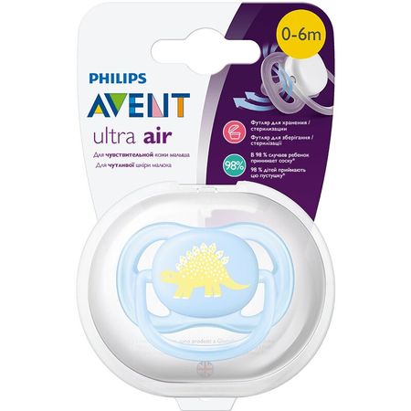 Пустышка Philips Avent ultra air SCF544/10 позволяет коже ребенка дышать. 4 увеличенных отверстия и легкий нагубник превосходно пропускают воздух, предотвращая раздражение от конденсата на коже. Кожа дышит, оставаясь сухой. Закругленные края нагубника минимизируют давление для комфорта малыша и бережного воздействия на кожу щек. МЯГКАЯ И ПРИЯТНАЯ НА ОЩУПЬ СОСКА • 98 % детей легко принимают наши пустышки ultra air* • Приятная на ощупь бархатистая соска для спокойствия и комфорта малыша • Учитывает естественное развитие неба, зубов и десен младенца СТЕРИЛИЗАЦИЯ ЗА 3 МИНУТЫ Благодаря футляру можно легко стерилизовать пустышку в микроволновой печи и сохранять ее стерильной вне дома. *Согласно результатам тестов, проведенных в США в 2016-2017 гг., в среднем 98 % малышей легко принимают соску Philips Avent с текстурированной поверхностью, которая используется в пустышках серии ultra air и ultra soft.