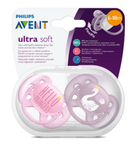 AVENT пустышка силик ultrasoft для девочек 6-18мес артикул scf223/02Пустышка Philips Avent ultra soft SCF223/02 невероятно мягкая и подходит для нежной кожи малыша. Позаботьтесь о нежной коже малыша, выбрав пустышку Philips Avent ultra soft. Невероятно мягкий и гибкий нагубник повторяет естественные контуры лица, оставляя меньше следов и раздражения на коже малыша.Закругленные края нагубника минимизируют давление для комфорта малыша и бережного воздействия на кожу щек.МЯГКАЯ И ПРИЯТНАЯ НА ОЩУПЬ СОСКА98 % детей легко принимают пустышки Philips Avent ultra soft*.Приятная на ощупь бархатистая соска для спокойствия и комфорта малыша.Пустышки Philips Avent имеют ортодонтическую форму и не оказывают влияние на нормальное формирование ротовой полости.ОДИН ЧЕХОЛ ДЛЯ СТЕРИЛИЗАЦИИ И ХРАНЕНИЯБлагодаря футляру можно легко стерилизовать пустышку за 3 минуты в микроволновой печи и сохранять ее стерильной вне дома.ХАРАКТЕРИСТИКИ:Возраст: от 6 до 18 мес.Пол: девочкиЦвет: розовый, фиолетовыйФорма: ортодонтическая симметричнаяСоска мягкая и бархатистаяВ комплект входят:Пустышка ultra soft 2 шт.Аксессуары в комплектеФутляр для стерилизации/хранения ДаБезопасностьКольцо-держатель для безопасности ДаБез бисфенола-А ДаГигиеничностьЛегко чистится ДаМожно стерилизовать ДаМожно мыть в посудомоечной машине Да*Согласно результатам тестов, проведенных в США в 2016-2017 гг., в среднем 98 % малышей легко принимают соску Philips Avent с текстурированной поверхностью, которая используется в пустышках серии ultra air и ultra soft.Использование. Изделие следует использовать только под наблюдением взрослых. В целях гигиены необходимо менять соску-пустышку каждые 4 недели. В случае, если соска-пустышка застрянет во рту, НЕ ПАНИКУЙТЕ. Конструкция сосок-пустышек разработана с учетом таких ситуаций, поэтому их невозможно проглотить. Осторожно, как можно мягче извлеките соску-пустышку изо рта. Не окунайте соску-пустышку в сладкие вещества или лекарственные препараты: это может стать причиной развития у ребенка кариеса.Хранение. Храните соску-пустышку в стерилизаторе/ контейнере для переноски или в сухой закрытой емкости. Не допускайте воздействия на соску-пустышку прямых солнечных лучей, не оставляйте ее возле открытого огня и в дезинфицирующем растворе дольше рекомендованного времени, так как это может привести к повреждению соски.