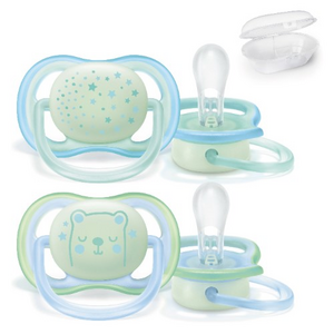 Пустышка Philips Avent ultra air night SCF376/11 имеет большие вентиляционные отверстия, чтобы чувствительная кожа малыша оставалась сухой. Кроме того, на пустышке есть светящийся в темноте элемент, который позволяет найти пустышку при выключенном свете.Закругленные края нагубника минимизируют давление для комфорта малыша и бережного воздействия на кожу щек. Большие отверстия для воздуха бережно проветривают кожу малыша, обеспечивая ее мягкость и сухость.МЯГКАЯ И ПРИЯТНАЯ НА ОЩУПЬ СОСКА98 % детей легко принимают наши пустышки ultra air* Приятная на ощупь бархатистая соска для спокойствия и комфорта малышаУчитывает естественное развитие неба, зубов и десен младенцаСТЕРИЛИЗАЦИЯ ЗА 3 МИНУТЫДорожный футляр выполняет функцию стерилизатора — вам просто нужно добавить воды и положить его в микроволновую печь. Пустышка вновь будет чистой перед следующим использованием.*Согласно результатам тестов, проведенных в США в 2016-2017 гг., в среднем 98 % малышей легко принимают соску Philips Avent с текстурированной поверхностью, которая используется в пустышках серии ultra air и ultra soft.