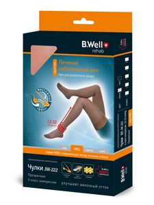 Чулки компрессионные с ажурным верхом B.Well rehab JW-222 II класс компрессии: 22-32 мм рт. ст. для улучшения венозного оттока при заболеваниях вен, хронической венозной недостаточности, для профилактики тромбоза глубоких вен.Механизм действия основан на распределенном (градуированном) давлении: максимальное в области щиколотки 22-32 мм. рт.ст., уменьшается в области голени, в области бедра компрессия минимальна.Регулярное ношение компрессионного трикотажа: Нормализует кровоток в нижних конечностях, Способствует перераспределению кровотока в глубокие вены, Улучшает работу венозных клапанов, Уменьшает нагрузку на сердечно — сосудистую систему, Препятствует развитию варикозаСовременные технологии обеспечивают высокую эффективность, комфорт и элегантность компрессионного трикотажа B.Well rehab3D вязка — специальная вязка «объемными сотами» помогает сохранить естественный влаго- и теплообмен кожи, обеспечивает высокий комфорт ношения.Нити класса «А» — комплексные нити с двойной S-образной оплёткой во встречных направлениях гарантируют необходимый компрессионный эффект и прочность.Кружевная резинка – мягкая и шелковистая кружевная резинка на силиконовой основе подходит даже для чувствительной кожи.*Массажный эффект — особое плетение на стопе обладает массажным эффектом, воздействует на биоактивные точки стопы, уменьшает усталость и стимулирует кровообращение.Усиленная стопа — усиленная носочная и пяточная части плотно фиксируются на стопе и уменьшают риск случайных повреждений, плоские мягкие швы обеспечивают комфорт ношения.Элегантный носок — прозрачная носочная часть комфортна для пальцев ног. Сам носок связан «наискосок» и незаметен в модельной обуви.Характеристики: Градуированная или распределенная компрессия. Чулки B.Well rehab обеспечивают физиологическое давление на поверхностные вены: на уровне лодыжек давление соответствует максимальному уровню (22-32 мм рт.ст. ), в области голени уменьшено, в области бедер минимально. Тем самым компрессионные чулки создают условия для перераспределения кровотока в более глубокие вены, улучшения оттока крови снизу-вверх и уменьшают риск тромбоэмболических осложнений. Эффективность подтверждена. Компрессионные изделия B.Well rehab проходят проверку на медицинскую эффективность. Тест HATRA — гарантия уровня и физиологического распределения компрессии, подтвержденная тестами на профессиональном оборудовании, рекомендованном в Британском стандарте BS 6612. Это значит, что компрессионное изделие достоверно улучшает отток венозной крови от ног к сердцу. Давление на поверхностные вены в области щиколотки соответствует заявленному классу компрессии, компрессионный терапевтический эффект сохраняется в течение всего гарантийного периода. Массажный эффект. Особое плетение на стопе обладает массажным эффектом, воздействует на нервные окончания и биоактивные точки подошвы стопы, уменьшает усталость и стимулирует кровообращение. Усиленная стопа. Усиленная носочная и пяточная части плотно фиксируются на стопе и уменьшают риск случайных повреждений, плоские мягкие швы обеспечивают комфорт ношения. Анатомичный дизайн. Эргономичная форма изделия обеспечивает легкость надевания и правильную посадку на ноге без образования складок. Кружевная резинка. Элегантная кружевная резинка на сили