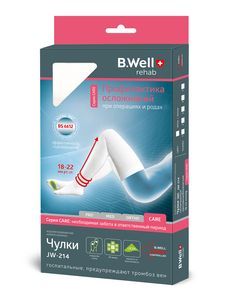 Чулки компрессионные госпитальные (противоэмболические) B.Well rehab JW-214, I класс компрессии 18-22 мм рт. ст. предназначены для профилактики венозных тромбозов и венозных тромбоэмболических осложнений (ВТЭО) в условиях стационара. Обеспечивают профилактику тромбообразования при беременности и послеродовый период, Способствуют усилению оттока венозной крови, препятствуют образованию тромбов, Помогают избежать осложнений после операции и родов — тромбоэмболии легочной артерии (ТЭЛА), Эффективно снижают риск развития тромбоза глубоких вен (за счет распределенной компрессии), Обеспечивают необходимую циркуляцию крови у лежачих больных, Выдавливают лимфодренаж и межтканевую жидкость, уменьшая образование отеков.3D соты — специальная вязка помогает сохранить естественный влаго- и теплообмен кожи, обеспечивает высокий комфорт использования.Нити класса «А» комплексные нити с двойной S-образной оплеткой во встречных направлениях придают компрессионным изделиям одновременно прочность и эластичность.Силиконовая резинка – резинка на силиконовой основе прочно фиксирует чулок на ноге, подходит даже для чувствительной кожи.*Открытая стопа — отверстие под пальцами позволяет контролировать состояние кожных покровов и ногтей.Отсутствие в составе латекса и соответствие требованиям Oeko-Tex Standard 100 обеспечивают гипоаллергенность госпитального трикотажа.Характеристики: Назначение. Предназначены для профилактики венозных тромбоэмболических осложнений (ВТЭО). Удобно для врача, комфортно для пациента. Чулки серии Care – противоэмболический трикотаж с высокой медицинской эффективностью, удобный для врача и пациента. Врач может легко и быстро осмотреть пациента, не тревожа его. Самому пациенту комфортно находиться в чулках B.Well rehab в течение всего времени пребывания в стационаре. Градуированная или распределенная компрессия. Противоэмболические чулки B.Well rehab обеспечивают физиологическое давление на поверхностные вены: на уровне лодыжек давление соответствует максимальному уровню (18-22 мм рт.ст. ), в области голени уменьшено, в области бедер минимально. Тем самым компрессионные чулки создают условия для перераспределения кровотока в более глубокие вены, улучшения оттока крови снизу-вверх и уменьшают риск тромбоэмболических осложнений. Эффективность подтверждена. Компрессионные изделия B.Well rehab проходят проверку на медицинскую эффективность согласно Британскому стандарту BS 6612. Тест HATRA является подтверждением соответствия распределенного давления физиологическому. Это значит, что компрессионное изделие достоверно улучшает гемодинамику нижней конечности согласно заявленному классу компрессии и компрессионный терапевтический эффект сохраняется в течение всего гарантийного периода. Отверстие под пальцами. Позволяет контролировать состояние кожных покровов и осуществлять при необходимости гигиенические процедуры в течение периода лечения. Удобство и комфорт. «3D» вязка, минимальная компрессия на область стопы, лайкра в составе и хорошая посадка позволяют комфортно носить чулки в течение всего периода лечения, в том числе и в ночное время. Анатомичный дизайн. Специальная вязка в области стопы позволяет проверить правильность надевания чулка и уменьшает скольжение в обуви. 3D вязка. Вязка 3D сотами позволяет коже «дышать», об