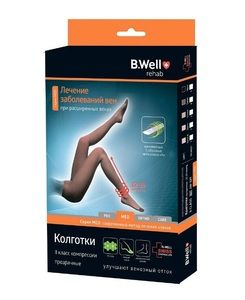 Колготки компрессионные II класс компрессии: 22-32 мм рт. ст. для улучшения венозного оттока при заболеваниях вен, хронической венозной недостаточности, для профилактики тромбоза глубоких вен.Механизм действия трикотажа основан на распределенном давлении: максимальное в области щиколотки 22-32 мм. рт.ст., уменьшается в области голени, в области бедра компрессия минимальна.Регулярное ношение компрессионного трикотажа: Улучшает венозный отток, Оказывает воздействие на поверхностные вены, Способствует уменьшению отеков ног, Уменьшает нагрузку на сердечно — сосудистую систему, Препятствует развитию варикоза.Современные технологии обеспечивают высокую эффективность, комфорт и элегантность компрессионного трикотажа B.Well rehab.Массажный эффект особое плетение на стопе обладает массажным эффектом, воздействует на нервные окончания и биоактивные точки подошвы стопы, уменьшает усталость и стимулирует кровообращение.3D вязка сохраняет естественный влаго- воздухообмен кожи, обеспечивает высокий комфорт при ношении.Усиленная стопа — усиленная носочная и пяточная части плотно фиксируются на стопе и уменьшают риск случайных повреждений, плоские мягкие швы обеспечивают комфорт ношения.Нити класса «А» с двойной S-образной оплеткой во встречных направлениях обеспечивают изделиям необходимый компрессионный эффект и прочность.Комфортные шортики с мягкой текстурой обеспечивают удобство при движении, а аккуратно вшитая ластовица – гигиеничность и долговечность колготок.Характеристики: Градуированная или распределенная компрессия. Колготки B.Well rehab обеспечивают физиологическое давление на поверхностные вены: на уровне лодыжек давление соответствует максимальному уровню (22-32 мм рт.ст. ), в области голени уменьшено, в области бедер минимально. Тем самым компрессионные чулки создают условия для перераспределения кровотока в более глубокие вены, улучшения оттока крови снизу-вверх и уменьшают риск тромбоэмболических осложнений. Эффективность подтверждена. Компрессионные изделия B.Well rehab проходят проверку на медицинскую эффективность согласно Британскому стандарту BS 6612. Тест HATRA является подтверждением соответствия распределенного давления физиологическому. Это значит, что компрессионное изделие достоверно улучшает гемодинамику нижней конечности согласно заявленному классу компрессии и компрессионный терапевтический эффект сохраняется в течение всего гарантийного периода. Массажный эффект. Особое плетение на стопе обладает массажным эффектом, воздействует на нервные окончания и биоактивные точки подошвы стопы, уменьшает усталость и стимулирует кровообращение. Усиленная стопа. Усиленная носочная и пяточная части плотно фиксируются на стопе и уменьшают риск случайных повреждений, плоские мягкие швы обеспечивают комфорт ношения Анатомичный дизайн. Эргономичная форма изделия обеспечивает легкость надевания и правильную посадку на ноге без образования складок Комфортные шортики. Мягкая текстура вязки и широкая резинка обеспечивают удобную и комфортную посадку колготок. Анатомичная форма соответствует современному крою в одежде и более удобна в ношении. Элегантный носок. Носочная часть изделия с укреплёнными местами стыков и мягкими швами комфортна для пальцев ног. Прозрачная носочная часть связана «наискосок» 