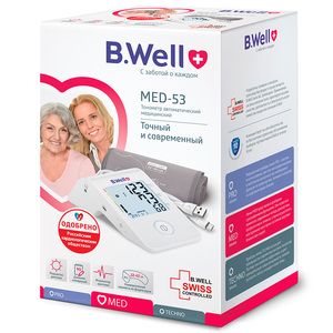 Тонометр автоматический B.Well MED-53 — современный, точный и надежный прибор для измерения артериального давления и частоты пульса. Тонометр оснащен технологией Intellect Active. Измерение происходит на этапе нагнетания воздуха в манжету и подстраивается под каждого пользователя индивидуально. Это позволяет измерить давление точно, быстро и комфортно.Тонометр автоматический на плечо MED-53 одобрен Российским кардиологическим обществом за точность.Анатомическая манжета для тонометра B.Well обеспечивает комфортное и точное измерение. Ее универсальный размер M-L (22-42 см) подойдет для любого члена семьи и человека с любым телосложением. Манжета удобна при надевании, так как ложится по форме руки. Плотное прилегание к руке помогает достичь более точного результата во время измерения. Съемный чехол манжеты можно постирать в стиральной машине.Тонометр B.Well MED-53 c USB оснащен контролем правильной фиксации манжеты. Специальный значок на дисплее сигнализирует о том, что манжета надета правильно. Если она надета туго или свободно, автоматический тонометр выдаст соответствующий сигнал об ошибке на дисплее.Тонометр MED-53 c USB-кабелем имеет подсветку экрана и широкий угол обзора до 90°. Цветная шкала помогает определить уровень своего давления по классификации Европейского общества гипертонии. Прибор для измерения давления сохраняет в памяти 90 результатов с датой и временем, что позволяет вести полноценный дневник АД.Тонометр для измерения давления B.Well MED-53 работает от обычного кабеля Micro-USB или от 4 стандартных батареек ААА. Кабель можно подключить к любому адаптеру, ноутбуку или powerbank. Длина кабеля составляет 1,5 м.Аппарат для измерения давления легко можно взять с собой в дорогу, а практичная сумка в комплекте защитит прибор от повреждений во время транспортировки.Xарактеристики Питание от Micro USB. Возможность работы от адаптера с Micro USB кабелем делает тонометр не только удобным, но и экономичным. Тонометр также может работать от 4 стандартных батарей ААА. Адаптер можно приобрести отдельно Подсветка дисплея. Подсветка дисплея для удобного измерения при любом освещении Контроль правильной фиксации манжеты. Контроль точности: прибор подскажет, правильно ли надета манжета. На точность измерения влияет правильное расположение манжеты и техника измерения давления. Специальный значок на дисплее тонометра MED-53 сигнализирует о том, что манжета надета правильно. Если манжета зафиксирована слишком туго или слишком свободно, тонометр выдаст сигнал об ошибке Цветная шкала уровня давления. Подскажет уровень измеренного давления по классификации Европейского общества гипертонии (ESH) Индикатор аритмии. Позволяет выявить нарушения сердечного ритма на ранней стадии Технология Intellect Active. Обеспечивает быстрое и бережное измерение. Тонометр проводит измерение на этапе нагнетания воздуха в манжету, подстраивается под каждого пользователя, определяя индивидуальный уровень накачки манжеты. Алгоритм Intellect Active позволяет провести измерение не только точно и быстро, но максимально комфортно Конусная манжета. Удобна при надевании, так как ложится по форме руки. Плотное прилегание к руке помогает достичь более точного результата во время измерения Универсальный размер манжеты M-L. Универсальная манжета M-L для обхвата руки 22-42 см удобна для всех членов семьи Память на 90 