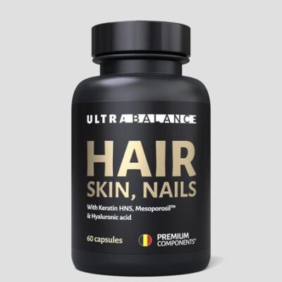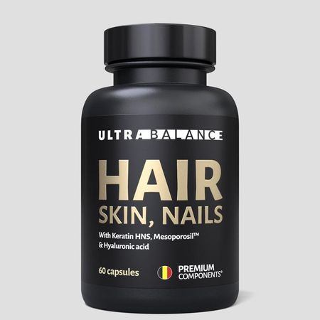Hair, Skin & Nails Premium от UltraBalance комплекс для волос, кожи и ногтей с биодоступными компонентами. Программа микронутриентов одинаково подходит мужчинам и женщинам, работает в комплексной формуле против выпадения волос и решения деликатных проблем с кожей и ногтями. Комбинация активных компонентов с кератином, гиалуроновой кислотой и запатентованной формулой MesoporoSil, легко усваивается и усиливает свою эффективность, благодаря экстракту черного перца BioPerine. Комплекс восстанавливает выработку кератина и коллагена, поддерживает водный баланс тканей и активно борется с признаками старения.Витаминно-минеральный комплекс для волос, кожи и ногтей устраняет сухость и шелушения, питая кожу лица изнутри, избавляет от прыщей, восстанавливает ослабленные волосы при выпадении, защищает ногти от расслоения и ломкости, усиливая выработку кератина.Дополнительный источник витаминов и минералов эффективен при сухости кожи, воспалениях, ломкости ногтей и волос, снижении общего тонуса организма и развитии возрастных признаков старения, связанных с нехваткой микроэлементов.В составе 18 витаминов и минералов бельгийского производства, объединенных уникальной формулой для красоты и здоровья. В составе пищевой добавки витамин С, A, B1, B2, B3, B5, B6 — токоферол, B9 — фолиевая кислота, B12, D3, E, витамин N — биотин (biotin), MSM, Keratine HNS, гиалуроновая кислота, медь, цинк, экстракт черного перца Bioperine, кремний Mesoporosil. Богатый состав и высокая концентрация веществ в капсуле. Программа нутриентов работает комплексно и показывает высокую степень биодоступности за счет комбинации усваиваемых компонентов. Витамин входит в поливитамины для лечения волос женщин и мужчин, мужские и женские мультивитамины и спортивное питание. Аминокислотный профиль кератина HNS на 90 % совпадает с профилем человеческого волоса. Это способствует максимальному усвоению и быстрой интеграции кератина в зависимые от него структуры. Мгновенно проникая в наружный слой кожи, кератин HNS фокусирует свой эффект на здоровье волосяных фолликулов: тонизирует кожу головы, укрепляет волосяные луковицы, заполняет структуру волос, трещины, восстанавливает кератиновый слой и способствует росту. Органическая природа кератина делает его хорошо усваиваемым, эффективным и безопасным при длительном приёме.