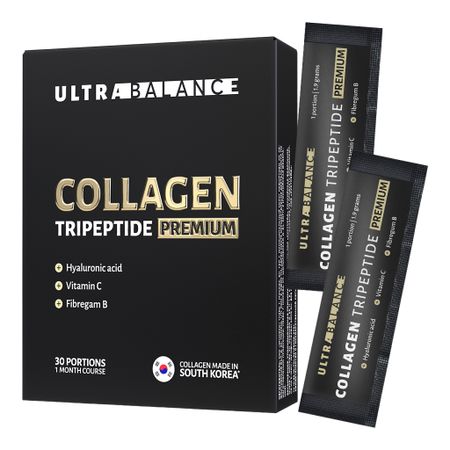 Морской CollagenTripeptide Premium от UltraBalance c гиалуроновой кислотой (Hyaluronicacid), витамином С (аскорбиновая кислота) и пробиотиком Fibregam B (камедь акации Фибрегам В). Для производства продукта используется современная форма коллагена — трипептид. Согласно тестированиям она показала свою эффективность и оказалась в 7 раз эффективнее, чем обычная форма пептидов коллагена. Трипептид коллагена произведен и привезен из Южной Кореи. Для производства трех пептидной формы коллагена используется морская рыба Niletilapia с глубокой ферментативной обработкой. Структура коллагена имеет форму тройной спирали и представляет собой набор одинаковых аминокислот (глицин, пролин, гидропролин). Впитывается напрямую в кишечнике, а не расщепляется на отдельные аминокислоты.