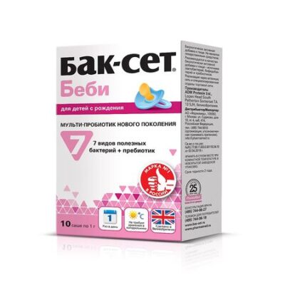 Биологическое действие комплекса: Состав комплекса уникален и подобран таким образом, что его компоненты усиливают и дополняют друг друга, восстанавливая микробный баланс и функции желудочно-кишечного тракта у новорожденных и детей раннего возраста. 7 видов живых пробиотических бактерий помогают восстановить микробный баланс кишечника, поддержать иммунитет, противостоять вредоносному воздействию болезнетворных микробов, аллергенов, токсинов, поступающих в организм из внешней среды. Фруктоолигосахариды (пребиотик) создают благоприятную среду для размножения в кишечнике собственной полезной микрофлоры. Что такое пробиотики и пребиотики? Препараты, содержащие живую полезную микрофлору, предназначенную для поддержания нормального баланса в кишечнике, называют пробиотиками. Попадая в кишечник, полезные бактерии помогают восстановить микробный баланс и справиться с дисбактериозом. Но никакие полезные бактерии, поступившие в кишечник извне, не живут там вечно, поэтому важно, чтобы в организме размножались собственные полезные микробы. Для это им надо создать благоприятные условия и снабдить питанием. Именно этой цели служат пребиотики. Попадая в кишечник, пребиотики создают там благоприятные условия для роста собственных полезных микробов, являясь пищей для них. Самыми распространенными пребиотиками природного происхождения являются фруктоолигосахариды (ФОС). Какими качествами должен обладать идеальный пробиотик? 1. Эффективность — высокая концентрация и жизнеспособность пробиотических бактерий 7 разных видов. Чтобы попасть в толстый кишечник, пробиотические бактерии преодолевают долгий путь через желудок и тонкий кишечник. Естественно, часть бактерий на этом пути гибнет и становится бесполезна. Исследованиями установлено, что полезная доза бактерий должна быть не менее 100 млн в сутки. В Бак-Сет беби содержится 1 миллиард всего лишь в 1 саше! Это количество обеспечивает высокую активность препарата. А особая щадящая технология производства максимально сохраняет жизнеспособность бактерий даже в кислой среде желудка! 2. Универсальность применения при различных нарушениях пищеварения и атопическом дерматите у детей грудного и раннего возраста. У различных видов пробиотиков в разной степени выражены те или иные полезные свойства; один единственный вид не в состоянии справиться с разнообразными нарушениями пищеварения. Поэтому в состав Бак-Сет беби входят 7 разных видов пробиотиков, которые взаимодополняют действие друг друга. Также комплекс обогащен пребиотиком, который создает благоприятные условия для роста полезных бактерий. 3. Удобство — высокая активность при комнатной температуре, всего 1 саше в день. Большинство пробиотических препаратов необходимо хранить в холодильнике, так как при комнатной температуре живые микробы погибают или утрачивают свою активность. Это не всегда удобно, такие пробиотики невозможно взять с собой. Бак-Сет беби производится по специальной технологии, позволяющей сохранять высокую жизнеспособность и активность пробиотических бактерий даже при комнатной температуре. Для достижения эффекта достаточно всего 1 саше в день. Содержимое саше можно разводить в воде, грудном молоке, детском питании. 4. Безопасность — не все пробиотики можно использовать у детей с рождения. В