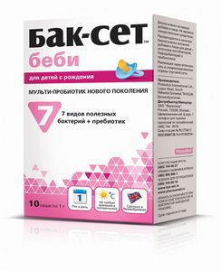5 причин использовать Бак-Сет беби Эффективность — высокая концентрация и жизнеспособность пробиотических бактерий; 7 разных видов бактерий + пребиотик усиливают действие друг друга Универсальность применения при различных нарушениях пищеварения и атопическом дерматите у детей грудного и раннего возраста Удобство – не требует хранения в холодильнике; всего 1 саше в день Безопасность — разрешен к применению с первых дней жизни Качество — гарантия жизнеспособности бактерий до конца срока годности. Произведен в ВеликобританииВ чем состоят полезные функции микрофлоры кишечника и как возникает дисбактериоз?Кишечная микрофлора участвует в пищеварении, обмене веществ, в обезвреживании болезнетворных бактерий, в поддержании иммунитета. В определенных случаях соотношение полезных и вредных бактерий в организме нарушается и тогда возникает дисбаланс, именуемый привычным словом «дисбактериоз». «Дисбактериоз» не обозначает какого-либо конкретного заболевания; это «собирательный» термин, объединяющий самые различные нарушения пищеварения. Происходит нарушение баланса микрофлоры из-за частого применения антибиотиков, неправильного питания, стрессов; часто дисбактериоз возникает при смене рациона питания и качества воды, а также при переходе на диету. У детей первого года жизни нарушения пищеварения часто возникают при переходе на искусственное вскармливание, введении прикорма, отлучении от груди. Часто расстройства стула появляются в период прорезывания зубов.У новорожденных и детей раннего возраста нарушения микрофлоры кишечника могут проявляться самыми разнообразными симптомами: упорным запором, или, наоборот, склонностью к жидкому стулу, а часто и их чередованием. Срыгивания, кишечные колики, плохая прибавка массы тела, атопический дерматит также могут быть проявлениями дисбактериоза кишечника. Вот почему особенно важно помочь ребенку в формировании нормального баланса полезной микрофлоры кишечника буквально с первых дней жизни!Что такое пробиотики и пребиотики?Живую полезную кишечную микрофлору, предназначенную для поддержания нормального баланса в кишечнике, называют пробиотиками. Попадая в кишечник, полезные бактерии помогают восстановить микробный баланс и справиться с дисбактериозом. Но никакие полезные бактерии, поступившие в кишечник извне, не живут там вечно, поэтому важно, чтобы в организме размножались собственные полезные микробы. Для это им надо создать благоприятные условия и снабдить питанием. Именно этой цели служат пребиотики. Попадая в кишечник, пребиотики создают там благоприятные условия для роста собственных полезных микробов, являясь пищей для них. Самыми распространенными пребиотиками природного происхождения являются фруктоолигосахариды (ФОС).Какими качествами должен обладать идеальный пробиотик? Эффективность — высокая концентрация и жизнеспособность пробиотических бактерий 7 разных видов. Для того, чтобы попасть в толстый кишечник, пробиотические бактерии преодолевают долгий путь через желудок и тонкий кишечник. Естественно, часть бактерий на этом пути гибнет и становится бесполезна. Исследованиями установлено, что полезная доза бактерий должна быть не менее 100 млн. в сутки. В Бак-Сет беби содержится 1 миллиард всего лишь в 1 сашете! Это количество обеспечивает в