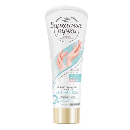 Бренд Бархатные Ручки представляет крем для рук БЕЗ ЗАПАХА. Сухая и чувствительная кожа рук требует специального и бережного ухода. Интенсивный крем с формулой Silk Oil Elixir, усиленной пантенолом и ромашкой, разработан специально для быстрого восстановления сухой и чувствительной кожи рук. Отдушки могут являться катализатором аллергии. Многие потребители не могут использовать крема с ярко-выраженным запахом из-за аллергической реакции. Крем Бархатные ручки не содержит отдушки и является гипоаллергенным, подходит для использования в сезон аллергии. Продукт рекомендован дерматологами и аллергологами. Крем обладает густой и ультра насыщенной текстурой, но при этом быстро впитывается без липкости и жирности. Текстура крема Без запаха самая насыщенная и концентрированная в основной линейке бренда Бархатные ручки . Крем для рук Бархатные ручки полностью подходит для использования для нее и для него. Универсальная формула крема полностью подходит как для женской, так и для мужской кожи рук. Формула продукта содержит 100% полезные компоненты, без красителей, парабенов, спирта, что снижает вероятность возникновения неприятных ощущений и возникновения аллергической реакции. Крем укрепляет собственный защитный барьер чувствительной кожи для предотвращения воздействия внешних агрессивных факторов. Формула продукта содержит Д-Пантенол и Ромашку. Д-пантенол восстанавливает и увлажняет сухую, чувствительную кожу рук. Ромашка успокаивает сухую и чувствительную кожу рук. Снимает признаки раздражения и шелушения кожи. [1] Свойства подтверждены клиническими исследованиями, РФ, 2019.