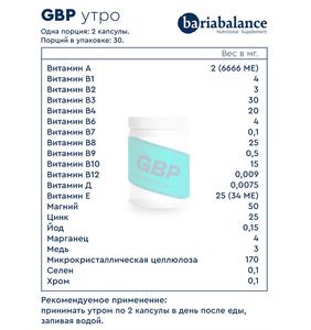 «BariaBalance GBP» Утро 60 капсул, «BariaBalance GBP» Вечер 30 капсул — дополнительный источник витаминов и микроэлементов.Свидетельство о государственной регистрации № AM.01.06.003.R.000204.10.21 Дата выдачи: 11.10.2021 г.Биологически активная добавка к пище, содержит комплекс жирорастворимых (A, D, Е, К1), водорастворимых витаминов (С и 8 витаминов группы В), витаминоподобные вещества группы В: витамин В4 (холин), В8 (инозитол) и В10 (парааминобензойная кислота) и минералы.Принимают при состояниях , сопровождающихся повышенной потребностью в витаминах и минеральных веществах, в т.ч. в период интенсивных психических и физических нагрузок, в период выздоровления после продолжительных и/или тяжело протекающих заболеваний, в т.ч. инфекционных, при неполноценном и несбалансированном питании.Способствует уменьшению риска развития гиповитаминозов и недостатка минеральных веществ у пациентов после различных модификаций желудочного шунтирования.«BariaBalance GBP» УтроКол-во активных веществ в 2-х капсулах в мг Витамин А 2 (6666 ME) Витамин В1 4 Витамин В2 3 Витамин ВЗ 30 Витамин В4 20 Витамин В6 4 Витамин В7 0,1 Витамин В8 25 Витамин В9 0,5 Витамин В10 15 Витамин В12 0,009 Витамин D3 0,0075 Витамин Е 25 (34 ME) Магний 50 Цинк 25 Йод 0,15 Марганец 4 Медь 3 Селен 0,1 Хром 0,1 «BariaBalance GBP» Вечер Кол-во активных веществ в 1-х капсуле в мг Витамин В5 12 Витамин С 120 (2400 ME) Витамин D3 0,0075 Витамин К1 0,125 Калий 50 Фосфор 35 Железо 20 Молибден 0,075