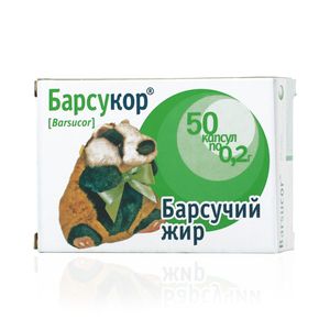 Барсучий жир барсукор — это биологически активная добавка (БАД) к пище — натуральный продукт, топленный барсучий жир в капсулированном виде. Капсулированная форма Барсукор не имеет запаха и вкуса, что упрощает пероральный прием барсучьего жира. Он богат витаминами А, Е, омега-3 жирными кислотами. Барсучий жир обладает муколитическим действием, эффективен для профилактики (в комплексной терапии) воспалительных заболеваний дыхательных путей, оказывает общеукрепляющее действие.Активные ингредиентыБарсучий жир имеет прекрасный и сбалансированный набор важных витаминов и элементов, которые помогают заболевшему улучшить состояние, и способствую облегчению неприятных респираторных симптомов простуды. Барсучий жир включает в себя 4 важных компонента:Витамин А (223 мкг в 100 гр),Витамин Е (6.6 мг в 100 гр.),ПЖК (15.1 г в 100 гр), а именно: Линолевая 8.6 г. и Линоленовая 3.95 г. кислоты.Все эти компоненты прекрасно дополняют друг друга. Например, витамин А (ретинол) и витамин Е (токоферол) усиливают действия друг друга, а их совместное применение эффективнее раздельного. Токоферол также предупреждает окисление витамина А, улучшает его усваиваемость. В свою очередь Витамины А и Е являются антиоксидантами клеточных мембран, содержащих ПНЖК (P.Y. Byund, 1996)Витамин А. Используется как иммуномодулятор при вирусных заболеваниях и для лечения поражений кожи. При недостатке Витамина А поражается эпителий слизистой в т.ч. дыхательной системы, повышает восприимчивость к инфекциям Ретинол стимулирует иммунные процессы в организме, оказывает антивирусное действие, поддерживает нормальное состояние кож, слизистых оболочек, проявляет значительное антиоксидантное действие. Данный эффект достигается за счет того, что клеточный ретинолсвязывающий протеин проникает в клеточное ядро и стимулирует клеточные процессы.Витамин Е. Необходим в регуляции иммунной системы, в улучшении тканевого дыхания. Мегаважную роль витамин Е играет в качестве антиоксидантного средства. Задерживает окисление витамина А. Защищает ПНЖК от перикисного окисления и повреждения свободными радикалами, солями тяжелых металлов и т.д.. (Петров В.И. Спасов А.А. — Российская энциклопедия биологически активных добавок к пище/ российский научно-исследовательский институт здоровья 78-83)Линолевая кислота и Линоленовая кислота. Являются полиненасыщенными незаменимыми жирными кислотами. «Незаменимость» связана с тем, что они не вырабатываются в организме человека, но необходимы для жизнедеятельности. Источником этих кислот служат потребляемые продукты питания. Данные полиненасыщенные жирные кислоты являются структурными элементами клеточных мембран и обеспечивают нормальное развитие и адаптацию организма человека к неблагоприятным факторам окружающей среды-