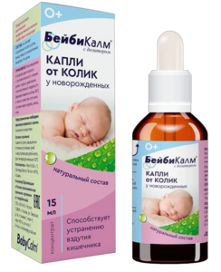 Бейби Калм — продукт детского диетического профилактического питания из смеси натуральных растительных масел: укропного, анисового, мятного.Бейби Калм является эффективным средством для младенцев, устраняющее метеоризм.Масло укропа выводит скопившиеся в кишечнике младенца газы и купирует спастические боли, обусловленные кишечной коликой или активной перистальтикой, которую родители слышат, как сильное урчание в животе. Кроме того, укропное масло оказывает антибактериальное и противовоспалительное действие, уничтожая патогенные микробы в кишечнике и купируя очаги воспаления, что также способствует нормализации пищеварения и хорошему самочувствию младенца.Масло аниса улучшает работу кишечника, купирует раздражение и снимает вздутие живота, благодаря чему у младенца проходят боли в животе и отходят газы.Масло мяты оказывает противовоспалительное и успокаивающее действие. Благодаря действию мяты у младенца купируются очаги воспаления в кишечнике, устраняются спазмы (колики) и снимается общее напряжение.Бейби Калм рекомендуется для детей первого года жизни при заболеваниях желудочно-кишечного тракта, сопровождающиеся повышенным газообразованием и вздутием живота (как средство, устраняющее метеоризм).Концентрат выпускается в форме раствора для перорального употребления. Раствор имеет приятный вкус, поэтому благосклонно воспринимается даже самыми привередливыми младенцами.Разработан препарат специально для новорожденных и младенцев с первых дней жизни. Благодаря уникальному природному составу и удачной комбинации действующих веществ лекарство оказывает быстрый терапевтический эффект:Устраняются спазмы гладкой мускулатуры пищеварительного тракта.Выходят кишечные газы, раздражающие стенки кишечника. Вздутие животика, метеоризм, колики быстро проходят.Газообразование мягко подавляется.Прием препарата также оказывает антибактериальное и противовоспалительное, успокаивающее действие.Нормализуется работа органов ЖКТ, активизируется функционирование кишечника.Препарат одинаково эффективен как для новорожденных, находящихся на грудном вскармливании, так и для деток-искусственников.Подходит это средство и для беременных, кормящих грудью женщин.Минимум противопоказаний и ограничений делает Бейби Калм очень популярным и широко применяемым в педиатрии средством.Бебикалм выпускается в единственной лекарственной форме — концентрат натуральных масел для приготовления раствора для приема внутрь.Суспензия не вызывает привыкания и действует исключительно симптоматически, поэтому теоретически Бейби калм можно давать сколько угодно долго. Однако врачи-педиатры рекомендуют давать средство ребенку только тогда, когда его действительно мучают метеоризм, вздутие живота и младенческие колики, и прекращать применение суспензии, когда данные неприятные симптомы проходят. Не следует давать Бейби калм для профилактики кишечных колик, метеоризма и вздутия живота.