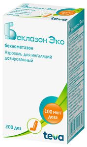 Показания к применениюБазисная терапия различных форм бронхиальной астмы у взрослых и детей.Применение при беременности и кормлении грудьюС особой осторожностью препарат Беклазон Эко следует применять при беременности и в период грудного вскармливания, лишь в том случае, если ожидаемая польза для матери превосходит возможный риск для плода и младенца.ПротивопоказанияПовышенная чувствительность к беклометазону и другим компонентам препарата детский возраст до 4 лет.Побочное действиеЧастота развития побочных эффектов классифицирована согласно рекомендациям Всемирной организации здравоохранения: очень часто (≥1/10) часто (≥1/100, <1/10) нечасто (>1/1000, <1/100) редко (≥1/10 000, <1/1000) очень редко (<1/10 000), частота неизвестна (нельзя установить по имеющимся данным).Инфекционные и паразитарные заболевания: очень часто – ларингит, фарингит часто — кандидоз ротовой полости и верхних дыхательных путей и глотки (при длительном применении в высоких дозах более 400 мкг в сутки) пневмония (у пациентов с ХОБЛ).Нарушения со стороны иммунной системы: редко — аллергические реакции: ангионевротический отек глаз, горла, губ и лица.Нарушения со стороны эндокринной системы: очень редко — угнетение гипоталамо-гипофизарно-надпочечниковой системы (ГГНС) (при длительном применении высоких доз более 1,5 г/сут), в том числе задержка роста у детей и подростков.Нарушения психики: частота неизвестна — психомоторная гиперактивность, расстройства сна, беспокойство, депрессия, агрессия, изменение поведения (преимущественно у детей).Нарушения со стороны нервной системы: нечасто – головная боль.Нарушения со стороны органа зрения: нечасто — нарушение четкости зрения (см. раздел Особые указания) очень редко — катаракта, глаукома (системное действие) частота неизвестна — центральная серозная ретинопатия.Нарушения со стороны дыхательной системы, органов грудной клетки и средостения: часто — охриплость голоса, раздражение слизистой оболочки горла (применение спейсера снижает вероятность развития этих побочных эффектов) редко — парадоксальный бронхоспазм (купируют с помощью ингаляционных бета2-адреномиметиков короткого действия) очень редко – эозинофильная пневмония.Нарушения со стороны кожи и подкожных тканей: очень редко — крапивница, сыпь, зуд, покраснение.Нарушения со стороны скелетно-мышечной и соединительной ткани: очень редко — снижение минеральной плотности костей (системное действие).При ингаляционном лечении ГКС (включая беклометазона дипропионат) могут возникнуть и другие системные эффекты, прежде всего, при длительном лечении высокими дозами. Вероятность возникновения таких эффектов значительно меньше, чем при лечении ГКС для приёма внутрь. Головная боль, тошнота, образование кровоподтеков или истончение кожи.