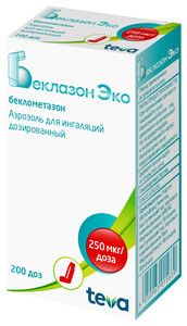 Показания к применениюБазисная терапия различных форм бронхиальной астмы у взрослых и детей.Применение при беременности и кормлении грудьюС особой осторожностью препарат Беклазон Эко следует применять при беременности и в период грудного вскармливания, лишь в том случае, если ожидаемая польза для матери превосходит возможный риск для плода и младенца.ПротивопоказанияПовышенная чувствительность к беклометазону и другим компонентам препарата детский возраст до 4 лет.Побочное действиеЧастота развития побочных эффектов классифицирована согласно рекомендациям Всемирной организации здравоохранения: очень часто (≥1/10) часто (≥1/100, <1/10) нечасто (>1/1000, <1/100) редко (≥1/10 000, <1/1000) очень редко (<1/10 000), частота неизвестна (нельзя установить по имеющимся данным).Инфекционные и паразитарные заболевания: очень часто – ларингит, фарингит часто — кандидоз ротовой полости и верхних дыхательных путей и глотки (при длительном применении в высоких дозах более 400 мкг в сутки) пневмония (у пациентов с ХОБЛ).Нарушения со стороны иммунной системы: редко — аллергические реакции: ангионевротический отек глаз, горла, губ и лица.Нарушения со стороны эндокринной системы: очень редко — угнетение гипоталамо-гипофизарно-надпочечниковой системы (ГГНС) (при длительном применении высоких доз более 1,5 г/сут), в том числе задержка роста у детей и подростков.Нарушения психики: частота неизвестна — психомоторная гиперактивность, расстройства сна, беспокойство, депрессия, агрессия, изменение поведения (преимущественно у детей).Нарушения со стороны нервной системы: нечасто – головная боль.Нарушения со стороны органа зрения: нечасто — нарушение четкости зрения (см. раздел Особые указания) очень редко — катаракта, глаукома (системное действие) частота неизвестна — центральная серозная ретинопатия.Нарушения со стороны дыхательной системы, органов грудной клетки и средостения: часто — охриплость голоса, раздражение слизистой оболочки горла (применение спейсера снижает вероятность развития этих побочных эффектов) редко — парадоксальный бронхоспазм (купируют с помощью ингаляционных бета2-адреномиметиков короткого действия) очень редко – эозинофильная пневмония.Нарушения со стороны кожи и подкожных тканей: очень редко — крапивница, сыпь, зуд, покраснение.Нарушения со стороны скелетно-мышечной и соединительной ткани: очень редко — снижение минеральной плотности костей (системное действие).При ингаляционном лечении ГКС (включая беклометазона дипропионат) могут возникнуть и другие системные эффекты, прежде всего, при длительном лечении высокими дозами. Вероятность возникновения таких эффектов значительно меньше, чем при лечении ГКС для приёма внутрь. Головная боль, тошнота, образование кровоподтеков или истончение кожи.