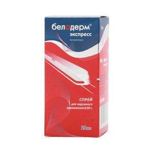 Показания к применениюЗаболевания кожи, поддающиеся глюкокортикостероидной терапии: • экзема (различные формы) • атопический дерматит / нейродермит • эритродермия • псориаз • буллезные дерматозы • экссудативная многоформная эритема • фотодерматозы (в том числе солнечный ожог) • аллергический контактный дерматит • контактный дерматит (в том числе профессиональный) • неаллергический дерматит (в том числе солнечный, лучевой) • реакции на укусы насекомых • кожный зуд различной этиологииПрименение при беременности и кормлении грудьюПрименение при беременности и в период лактации Перед применением препарата, если Вы беременны, или предполагаете, что Вы могли бы быть беременной, или планируете беременность необходимо проконсультироваться с врачом. Применение препарата Белодерм® экспресс, спрей для наружного применения у беременных допускается в тех случаях, когда предполагаемая польза для матери превышает риск для плода. В таких случаях применение препарата должно проводиться под контролем врача, должно быть непродолжительным и, по возможности, ограничиваться небольшими участками кожных покровов. При необходимости применения препарата в период лактации следует прекратить грудное вскармливание.ПротивопоказанияПовышенная чувствительность к бетаметазону или к любому из вспомогательных компонентов препарата, бактериальные (туберкулез кожи, кожные проявления сифилиса), грибковые, вирусные (ветряная оспа, простой герпес) кожные заболевания, кожные поствакцинальные реакции, открытые раны, трофические язвы голени, розацеа, вульгарные угри, рак кожи, невус, атерома, меланома, гемангиома, ксантома, саркома, период лактации, детский возраст до 2 лет.Побочное действиеПри применении в терапевтических дозах препарат, как правило, хорошо переносится, побочные явления отсутствуют или слабо выражены. Как и при применении других ГКС, могут развиться реакции гиперчувствительности (кожный зуд, жжение, краснота, сухость кожи, акнеподобные изменения (стероидные угри, периоральный дерматит, аллергический контактный дерматит, гипопигментация)). При длительном применении, а также при использовании окклюзионных повязок – мацерация кожи, вторичные инфекции, атрофия кожи, гирсутизм, гипертрихоз, телеангиэктазии, фолликулит, потница, пурпура. При нанесении на обширные поверхности тела возможно возникновение системных побочных эффектов ГКС (гипергликемия, глюкозурия, обратимое угнетение функции коры надпочечников, проявление синдрома Иценко-Кушинга). В случае появления реакции гиперчувствительности или побочных явлений терапию следует отменить и обратиться к врачу. Если у Вас отмечаются побочные эффекты, указанные в инструкции, или они усугубляются, или Вы заметили любые другие побочные эффекты, не указанные в инструкции, сообщите об этом врачу.