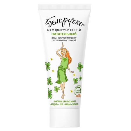Комплекс четырех ценных маселДля уверенности в красоте кожи рук и ногтей используйте крем ПИТАТЕЛЬНЫЙ с комплексом из четырех ценных масел для ежедневного ухода в любое время года.Мягкая, гладкая и нежная кожа за 1 минуту!*Крем с легкой тающей текстурой полноценно питает кожу рук и зону кутикулы, способствует росту здоровых ногтей. Благодаря специальному составу на основе четырех ценных растительных масел крем помогает восстановить липидный баланс кожи, необходимый для поддержания ее защитной функции. Масло Миндаля способствует росту и укреплению ногтей.Масло Ши поддерживает упругость и эластичность кожи.Масла Какао участвует в формировании защитного кожного барьера.Масло Жожоба смягчает и увлажняет кожу и ногти, поддерживает упругость и эластичность ногтевых пластин.Белоручка – стильный, нежный и бережный уход за молодой кожей рук! * по собственной оценке 45 женщин (18-35 лет)