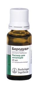 Показания к применениюПрофилактика и симптоматическое лечение хронических обструктивных заболеваний дыхательных путей с обратимой обструкцией дыхательных путей, таких как бронхиальная астма и, особенно, ХОБЛ, хронический обструктивный бронхит с наличием эмфиземы или без нее.Применение при беременности и кормлении грудьюДанные доклинических исследований и опыт применения у человека показывают, что фенотерол или ипратропия бромид не оказывают негативного влияния при беременности. Следует учитывать возможность ингибирующего эффекта фенотерола на сократительную активность матки. Препарат противопоказан в I и III триместрах (возможность ослабления родовой деятельности фенотеролом). Следует с осторожностью применять препарат во II триместре беременности. Фенотерол выделяется с грудным молоком. Данных, подтверждающих, что ипратропия бромид проникает в грудное молоко, не получено. Однако следует с осторожностью назначать Беродуал кормящим матерям. Клинические данные о влиянии комбинации ипратропия бромида и фенотерола гидробромида на фертильность не известны.Противопоказаниягипертрофическая обструктивная кардиомиопатия, тахиаритмия, I и III триместры беременности, повышенная чувствительность к фенотеролу и другим компонентам препарата, повышенная чувствительность к атропиноподобным препаратам. С осторожностью следует назначать препарат при закрытоугольной глаукоме, артериальной гипертензии, сахарном диабете, недавно перенесенном инфаркте миокарда (в течение последних 3 мес), заболеваниях сердца и сосудов (сердечная недостаточность, ИБС, порок сердца, аортальный стеноз, выраженные поражения церебральных и периферических артерий), гипертиреозе, феохромоцитоме, гиперплазии предстательной железы, обструкции шейки мочевого пузыря, муковисцидозе, во II триместре беременности, в период грудного вскармливания.СоставФенотерола гидробромид 500 мкг, ипратропия бромида моногидрат 261 мкг, в пересчете на безводный ипратропия бромид 250 мкг. Вспомогательные вещества: бензалкония хлорид, динатрия эдетата дигидрат, натрия хлорид, хлористоводородная кислота 1н, вода очищенная 20 мл, флаконы темного стекла с полиэтиленовой капельницей и завинчивающейся полипропиленовой крышкой с контролем первого вскрытия 1, пачки картонные.