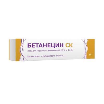Показания Уменьшение воспалительных проявлений сухих и гиперкератических дерматозов, чувствительных к терапии ГКС, в том числе — псориаза, хронического атопического дерматита, нейродермита, плоского лишая, экземы (в том числе монетовидной экземы, экземы кистей рук, экзематозного дерматита), дисгидроза, себорейного дерматита волосистой части головы, ихтиоза и других ихтиозоподобных состояний. Фармакологические свойства БЕТАНЕЦИН СК — комбинированный препарат, содержащий действующие вещества бетаметазона дипропионат и салициловую кислоту. Бетаметазона дипропионат — синтетический фторированный глюкокортикостероид (ГКС) — оказывает противовоспалительное, противозудное и сосудосуживающее действие. Салициловая кислота, обладая кератолитическим действием, способствует проникновению бетаметазона в кожу. Обладает бактериостатическим и некоторым фунгицидным действием. Сочетанное действие активных компонентов приводит к быстрому снижению выраженности таких симптомов как зуд, раздражение, эритема и боль.