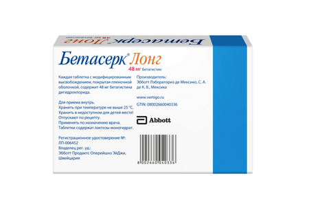 Главная » Аптека Бетасерк Лонг 48 мг, 30 шт, таблетки с модифицированным высвобождением покрытые пленочной оболочкой Просмотров 6 Эбботт Лэбораториз де Мексико С А де К В