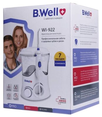 B.Well WI-922 — стационарный ирригатор для всей семьи. В этом приборе все предусмотрено для комплексного ухода за полостью рта и профилактики развития заболеваний слизистой оболочки полости рта. Может использоваться как в домашних условиях, так и в стоматологических клиниках при проведении лечебно-профилактических манипуляций в отношении полости рта пациента. Ирригатор B.Well работает в импульсном режиме, именно такой принцип работы ирригатора имеет доказанную эффективность. Учитывая принцип работы ирригатора B.Well WI-922 основной функцией данной модели является массаж (гидромассаж) слизистой оболочки полости рта. С WI-922 легко подобрать нужный уровень напора струи для каждого – прибор имеет 10 режимов мощности от 207 – 827 кПа. Плавная непрерывная регулировка мощности позволяет скорректировать напор в зависимости от Ваших ощущений. В комплект входят 7 насадок: Насадка стандартная предназначена для комплексного ухода за ротовой полостью: очищения межзубных промежутков и массажа десен. Насадка для чистки языка предназначена для удаления налета с языка и придания свежести дыханию. Насадка пародонтологическая предназначена для очищения десневого края и десневых карманов, а также для очистки поверхности челюсти под протезами и мостовыми конструкциями. Насадка ортодонтическая предназначена для очищения промежутков между плотно расположенными зубами и десневого края. Также обеспечивает гигиену брекет-систем и других ортодонтических конструкций. Насадка для имплантов, мостов, коронок и виниров предназначена для деликатной очистки поверхности имплантов, мостов, коронок и виниров. Насадка вращается на 360 градусов, чтобы очистить самые труднодоступные места. В комплект прибора входит 7 насадок: 3 стандартные насадки для всей семьи, а также специальные насадки для языка, брекетов, десен, искусственных конструкций. Насадки удобно хранить в специальном футляре под крышкой прибора. Ирригатор WI-922 работает от сети. Беспрерывное время работы составляет до 30 минут. Резервуар для воды рассчитан на 600 мл. Продуманная конструкция – наличие держателя для ручки прибора, противоскользящие устойчивые ножки, длинный шланг для воды – делает прибор B.Well удобным в использовании.