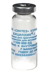 Показания к применениюИнфекционные заболевания, вызванные чувствительными к препарату микроорганизмами (особенно при необходимости длительного поддержания терапевтической концентрации), в т.ч. острый тонзиллит, скарлатина, раневые инфекции, рожистое воспаление. ревматизм (профилактика и лечение), вызываемые трепонемами (сифилис, фрамбезия), лейшманиоз.Применение при беременности и кормлении грудьюБициллин-5 в небольших количествах проникает через плацентарный барьер и в молоко матери. Применение при беременности возможно только в том случае, когда предполагаемая польза для матери превышает потенциальный риск для плода. Рекомендуется прекратить грудное вскармливание при необходимости назначения препарата.ПротивопоказанияГиперчувствительность, (в т.ч. к др. пенициллинам и компонентам препарата). С осторожностью бронхиальная астма, поллиноз, крапивница и др. аллергические заболевания. гиперчувствительность к различным ЛС, в т.ч. к антибиотикам и сульфаниламидам (в анамнезе).Побочное действиеСо стороны сердечно-сосудистой системы и крови (кроветворение, гемостаз):&nbsp,анемия, тромбоцитопения, лейкопения, гипокоагуляция.Аллергические реакции: сыпь на коже и слизистых оболочках, крапивница, эозинофилия, боль в суставах, мультиформная эритема, эксфолиативный дерматит, отек Квинке, анафилактический шок.Прочие: головная боль, повышение температуры тела, артралгия, стоматит, глоссит, болезненность в месте введения. при длительной терапии — суперинфекция, вызванная устойчивыми к препарату микроорганизмами и грибами.Состав1 флакон вместимостью 10 мл (Бициллин-5) с порошком для приготовления инъекционного раствора для в/м (внутримышечно) введения содержит: бензатина бензилпенициллина 1200000 ЕД и бензилпенициллина новокаиновой соли 300000 ЕД.Взаимодействие с другими препаратамиБактерицидные антибиотики (в т.ч. цефалоспорины, ванкомицин, рифампицин, аминогликозиды) оказывают синергидное действие, бактериостатические (в т.ч. макролиды, хлорамфеникол, линкозамиды, тетрациклины) — антагонистическое. Повышает эффективность непрямых антикоагулянтов (подавляя кишечную микрофлору, снижает протромбиновый индекс), снижает эффективность пероральных контрацептивов, лекарственных средств, в процесе метаболизма которых образуется парааминобензойная кислота, этинилэстрадиола — риск развития кровотечений прорыва. Диуретики, аллопуринол, блокаторы канальцевой секреции, фенилбутазон, НПВС, снижая канальцевую секрецию, повышают концентрацию бензилпенициллина в крови и тканях. Аллопуринол повышает риск развития аллергических реакций (кожной сыпи).