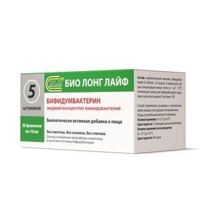 БИФИДУМБАКТЕРИН ЖИДКИЙ КОНЦЕНТРАТ — жидкость светло коричневого цветаЖидкий концентрат бифидобактерий БИФИДУМБАКТЕРИН является биологически активной добавкой — источником пробиотических микроорганизмов (бифидобактерий), соответствует требованиям Технических регламентов Таможенного Союза — ТР ТС 021/2011 и ТР ТС 022/2011.Жидкий концентрат бифидобактерий «БИФИДУМБАКТЕРИН» — это уникальный комплекс, на основе живых бифидобактерий и продуктов их метаболизма. Бифидобактерии являются важнейшими представителями микробиома человека, как в количественном отношении, их удельный вес в составе микробиома кишечника составляет от 85 до 98 %, так и в качественном, учитывая их роль в поддержании гомеостаза организма человека. Бифидобактериям принадлежит ведущая роль в нормализации микробиоценоза кишечника, поддержании неспецифической резистентности организма, улучшении процессов всасывания и гидролиза жиров, белкового и минерального обмена, синтезе биологически активных веществ, в том числе, витаминов. Дефицит бифидобактерий является одним из патогенетических факторов длительных кишечных нарушений у детей и взрослых, ведущий к формированию хронических расстройств пищеварения. Бифидобактерии проявляют иммуностимулирующую активность, нейтрализуют токсины в толстом кишечнике, способствуют росту и развитию других представителей нормофлоры.ДЕЙСТВИЕ:Кишечная флора выполняет множество функций, и ее бактерии находятся в постоянной связи с клетками нашего тела до такой степени, что наша кишечная флора, это по сути, наш второй мозг. Бактерии играют три важные роли: они являются солдатами нашего пищеварительного тракта, предотвращая проникновение посторонних веществ (патогены, токсины, аллергены), тем самым снижая риск заражения и болезни, они оказывают нормализующее действие на количественный и качественный состав микрофлоры кишечника, они помогают переваривать пищу, перерабатывая ее и производя новые молекулы (витамины, ферменты, жирные кислоты и др.), они помогают развивать иммунную систему и слизистую оболочку кишечника, обеспечивая лучшую защиту. Таким образом, они нормализуют пищеварительную и защитную функции кишечника, активизируют обменные процессы, повышают неспецифическую резистентность организма.Когда кишечная флора не сбалансирована, так называемые плохие бактерии берут верх, что может привести к болезням, инфекциям, проблемам с пищеварением, усталости, депрессии и т. п. Каждый день наша кишечная флора нарушается нашей диетой, стрессом, лекарствами (особенно антибиотиками) и образом жизни. Поскольку наша кишечная флора колоссально важна для нашего здоровья, важно поддерживать ее диверсифицированной и сбалансированной. Именно в этот момент на помощь организму приходят пробиотики. В борьбе с плохими бактериями (патогенами), пробиотики форсируют количество хороших бактерий повсеместно в кишечном тракте, таким образом способствуя увеличению сбалансированной кишечной флоры.