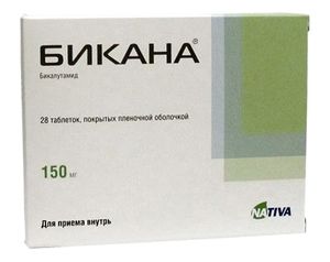Показания к применениюРак предстательной железы — в составе комбинированной терапии с аналогом Гн РГ или с хирургической кастрацией.Применение при беременности и кормлении грудьюНе назначают пациентам женского пола.Противопоказания Одновременный прием с терфенадином, астемизолом, цизапридом; детский возраст, повышенная чувствительность к бикалутамиду. Не назначают пациентам женского пола.Побочное действиеСо стороны эндокринной системы: приливы, болезненность молочных желез и гинекомастия, снижение либидо. Со стороны пищеварительной системы: боли в животе, диарея, тошнота, рвота, повышение уровня трансаминаз, желтуха, холестаз. Со стороны ЦНС: возможны астения, депрессия. Дерматологические реакции: алопеция, восстановление роста волос, зуд, сухость кожи. Прочие: гематурия. СоставБикалутамид 150 мг. Вспомогательные вещества: магния алюминометасиликат — 30 мг, карбоксиметилкрахмал натрия — 12 мг, магния стеарат — 6 мг, лудипресс — 402 мг. Состав пленочной оболочки: Опадрай II желтый 85 F 32733 — 24 мг, в т.ч. поливиниловый спирт — 35-49%, тальк — 9.8-25%, макрогол 3350 — 7.35-35.2%, титана диоксид и железа оксид желтый — 15.15-30%. Взаимодействие с другими препаратамиПри применении бикалутамида в течение 28 дней на фоне приема мидазолама, АUC мидазолама увеличивалась на 80%. При одновременном применении бикалутамида с циклоспорином или блокаторами кальциевых каналов возможно потенцирование или развитие нежелательных реакций. Теоретически возможно повышение концентрации бикалутамида в плазме крови при его одновременном применении с ингибиторами микросомальных ферментов печени, что может сопровождаться увеличением частоты возникновения нежелательных реакций. Исследования in vitro показали, что бикалутамид может вытеснять антикоагулянт кумаринового ряда варфарин из участков связывания с белками плазмы.