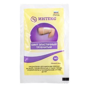 Бинт эластичный, трубчатый, №5 предназначается для фиксации повязок на коленном суставе взрослых, голове, грудной клетке, а также тазобедренном суставе детей. Уверенно и деликатно фиксирует место перевязки.Каждый бинт имеет индивидуальную упаковку, показан для разового использования. Размер бинта можно моделировать, отрезав от него полотно нужной длины.Индивидуальная упаковка изготовлена из пленки ПВХ, оснащена маркировкой на каждом изделии. Упаковка не пропускает воду, защищает бинты от повреждений при хранении и транспортировке.