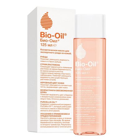 Косметическое масло Bio-Oil — это универсальное средство, разработанное ведущими экспертами для уменьшения видимости шрамов, растяжек, неровного тона и сухости кожи. Его эффективность обеспечивает комбинация наиболее важных для кожи составляющих: это — витамины А и Е, натуральные масла календулы, лаванды, розмарина и ромашки. А уникальный ингредиент PurCellin Oil позволяет Bio-Oil впитываться быстрее и гарантирует его целенаправленное воздействие. Растяжки: Bio-Oil улучшает внешний вид, увеличивая выработку коллагена, отвечающего за тонус и упругость кожи. Ежедневное использование Bio-Oil предотвращает появление новых растяжек во время беременности, быстрых изменений веса и подростковом скачке роста. Средство глубоко увлажняет, повышает эластичность и поддерживает тонус кожи. Рубцы и шрамы: Клинически доказано, что масло Bio-Oil улучшает внешний вид поврежденной кожи. Оно сглаживает следы шрамов, царапин, акне и ветрянки, солнечных и иных термических ожогов. Уникальная формула с витамином Е способствует регенерации клеток, питает рубцовую область, восстанавливая максимальный уровень утраченной эластичности и улучшая ее упругость. Bio-Oil снимает зуд, который возникает во время заживления рубцов. Беременность: Bio-oil эффективно и безопасно помогает противостоять изменениям кожи во время беременности. Средство сохраняет эластичность и уменьшает появление растяжек на груди, животе, бедрах и ягодицах. Bio-Oil бережно заботится о вашем теле, уменьшая неприятный зуд, убирая сухость и дискомфорт. Для профилактики растяжек используйте масло Bio-Oil с первого триместра беременности. Сухая и обезвоженная кожа: Уникальное сочетание витаминов и растительных экстрактов Bio-Oil обеспечивает длительное увлажнение кожи и устраняет симптомы сухости. Масло восстанавливает гидролипидный баланс, который нарушается под воздействием ветра, солнца, воды и сухого воздуха в помещениях, и возвращает коже гладкость и мягкость. Пигментные пятна и неровный тон кожи: При регулярном применении масло Bio-Oil способствует выравниванию тона кожи, уменьшает видимость пигментных и прочих пятен, вызванных гормональными колебаниями и другими причинами. Эффективность Bio-Oil зависит от действия бисаболола, содержащегося в ромашке, который действует на устранение пигментации кожи. Возрастные изменения: Bio-Oil помогает замедлить появление признаков старения за счет увеличения выработки коллагена и интенсивного увлажнения. Масло возвращает коже упругость и эластичность, а витамин Е борется со свободными радикалами, обладая высокими антиоксидантными свойствами. Масло Bio-Oil идеально для ежедневного ухода. Оно быстро впитывается и не оставляет на коже липкой пленки. Масло гипоаллергенно, подходит для чувствительной кожи, разрешено к применению с первых дней беременности.