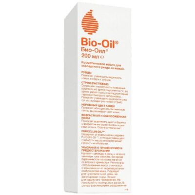 Косметическое масло Bio-Oil — это экспертный уход за кожей. Помогает уменьшить видимость рубцов, растяжек, выровнять тон кожи. Также рекомендован к использованию для возрастной и обезвоженной кожи.В составе: — витамины А и Е; — масла календулы, лаванды, розмарина и ромашки; — уникальный ингредиент PurCellin Oil, который уменьшает плотность масла и позволяет ему быстро впитываться и доставлять все полезные составляющие в глубокие слои дермы; Масло гипоаллергенно, подходит для чувствительной кожи, разрешено к применению с первых дней беременности для профилактики появления растяжек. Эффективность подтверждена многочисленными клиническими испытаниями. Рубцы — помогает уменьшить видимость рубцов, в том числе и рубцов после акне, следов ветрянки. Растяжки — эффективно для профилактики растяжек (во время беременности, резкого роста в подростковый период и значительных скачков веса), и уменьшает видимость уже существующих растяжек. Неровный тон кожи — помогает выровнять тон кожи и обесцветить пигментные пятна, в том числе появившиеся в результате гормональных изменений или длительного пребывания на солнце. Возрастные изменения кожи — выравнивает цвет и борется с возрастными изменениями кожи. Обезвоженная кожа — помогает восполнить баланс кожи, защищает ее от погодных условий, воды с высоким содержанием хлора, сухости вызванной центральным отоплением или кондиционером. Идеально для ежедневного ухода и увлажнения кожи, смягчения кожи после нахождения на солнце, может также использоваться как масло для ванны.