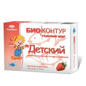 Детский рыбный жир «БиоКонтур» — натуральный источник полиненасыщенных жирных кислот Омега-3.Омега-3 кислоты не синтезируются в организме, но ежедневно расходуются на поддержание работы мозга и всех систем растущего детского организма. Поэтому очень важно, чтобы данные кислоты регулярно и в достаточном количестве поступали в детский организм с пищей или пищевыми добавками.Омега-3 ПНЖК (полиненасыщенные жирные кислоты) выполняют много важных и полезных функций в организме ребёнка: помогают формированию головного мозга и нервной системы, способствуют интеллектуальному развитию и остроте зрения, помогают избавиться от диатеза (атопического дерматита), помогают противостоять депрессиям, проявляющимся у детей в виде беспочвенной агрессии и лёгкой возбудимости, помогают избежать синдрома гиперактивности – состояния, при котором ребёнок не может сосредоточиться, плохо усваивает новые знания, способствуют правильному формированию иммунной системы