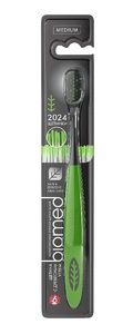 Зубная щетка Black, средняяСпециальная форма головки обеспечивает легкий и быстрый доступ к жевательным зубам для эффективного очищения. Клинически доказанный эффект очищения за 30 секунд!Комплексная зубная щетка Biomed Черная Щетина с древесным углем Щетина средней жесткости 2024 щетинкиПеред использованием новую зубную щетку промыть в теплой воде с мылом. Во время использования хранить щетку в вертикальном положении щетиной вверх.Для оптимального результата рекомендуется чистить зубы в течение 2 минут.*Щетина с угольным напылением способствует эффективному удалению зубного налета.**Закругленные кончики щетинок делают процесс чистки зубов безопасным и не травмируют десны.