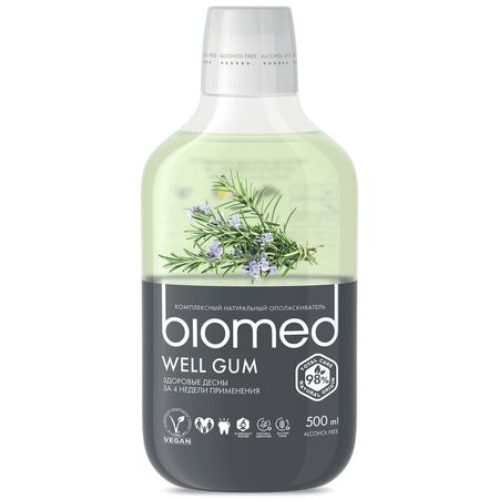 Натуральный комплексный ополаскиватель Biomed Well Gum с приятным мятно-травяным вкусом оздоравливает десны за 4 недели применения. На 99% состоит из компонентов натурального происхождения. Антикариесный и противовоспалительный эффект дают растительные экстракты (шалфея, подорожника, листьев березы). Антиоксидантное и антисептическое действие оказывают 5 эфирных масел (эвкалипта, аниса, кедра, гвоздики, розмарина). Фермент бромелайн расщепляет белковый налет. Рекомендован взрослым и детям от 6 лет (под контролем родителей).