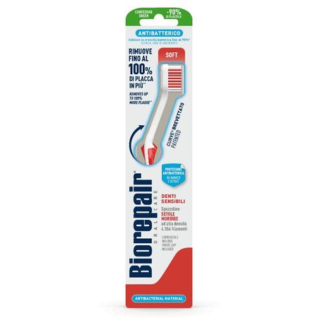 Создана по новейшей технологии с нанесением на щетину специальных частиц microRepair®, которые восстанавливают эмаль. Состав частиц microRepair® идентичен природному гидроксиапатиту, из которого состоят эмаль и дентин. Благодаря своей игольчатой структуре частицы microRepair® встраиваются в микротрещины эмали, восстанавливают ее и возвращают гладкость. — Имеет запатентованную эргономичную ручку с уникальным изгибом головки, которая обеспечивает больший доступ к труднодоступным местам и облегчает процесс гигиены; — Головка и ручка зубной щетки обработаны самоочищающимся полимером SCP (Self Cleaning Polymer), который препятствует размножению бактерий; — Содержит 4.554 щетинок (это в 4,5 раза больше, чем у стандартных щеток). Такая высокая плотность позволяет добиться качественного и бережного удаления налета с поверхностей зубов; — На задней стороне есть специальная щетка для языка, которая обеспечивает полный уход за полостью рта; — Прямой срез и высокая плотность щетинок обеспечивает глубокое очищение и удаление налета, не повреждая зубы и дёсны; — Имеет яркий дизайн из 4-х цветов: синий, персиковый, зеленый, голубой. Основные функции Total Sensitive Soft: Препятствует размножению бактерий, благодаря обработке самоочищающимся полимером SCP; Обеспечивает доступ к любому месту в полости рта; Деликатное удаление налета с поверхностей зубов; Снижает чувствительность зубов. Рекомендована: Для ежедневного ухода за полостью рта; Для снижения чувствительности зубов; Для людей с клиновидным дефектом зубов; Для профилактики кариеса; Для взрослых и детей старше 14 лет.