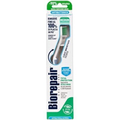 Biorepair CURVE Total Protection (Protezione Totale) — первая зубная щётка средней жесткости на рынке профессионального ухода за полостью рта на основе microRepair. Зубная щётка Biorepair CURVE Protezione Totale Medium разработана с использованием современных технологий, чтобы обеспечить комплексный уход за полостью рта. Она сочетает в себе среднюю жесткость щетины, что делает её подходящей для большинства пользователей, обеспечивая эффективное очищение зубов и бережное отношение к деснам. Элегантный дизайн и эргономичная форма делают эту щётку привлекательной и удобной в использовании. Основные особенности: — Средняя жесткость щетины: Обеспечивает баланс между мягким и жестким очищением, эффективно удаляя налёт, не повреждая десны; — Технология Biorepair: Щётка содержит микрочастицы гидроксиапатита, которые способствуют восстановлению эмали и повышению прочности зубов; — Головка и ручка зубной щетки обработаны самоочищающимся полимером SCP (Self Cleaning Polymer), который препятствует росту и развитию бактерий на щетине и поверхности щетки; — Резиновая рельефная часть на обратной стороне бережно очищает язык и щеки, обеспечивая полный уход за полость рта. Эффект от применения: — Эффективное удаление налёта и остатков пищи, способствующее улучшению состояния полости рта. — Поддержание здоровья десен и зубной эмали за счёт бережного и заботливого очищения. — Улучшение состояния зубов благодаря микрочастицам гидроксиапатита, способствующим восстановлению эмали.