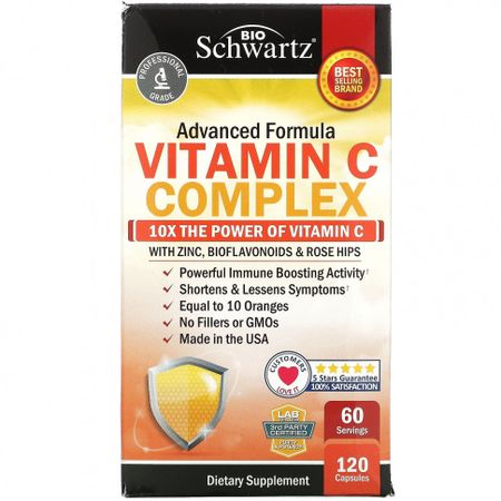 Информация о добавкахServing Size: 2 Capsules Serving Per Container: 60 Amount Per Serving%Daily Value*Vitamin C (ascorbic acid)1000 mg 1111%Zinc (zinc citrate)22 mg 200%Citrus Bioflavonoids 20 mg *Rose Hips (Rosa canina)10 mg **Daily Value (DV) not established. Профессиональное средствоСамый популярный бренд Антиоксидантная сила витамина C, увеличенная в 10 раз Мощное укрепление иммунитетаСокращает длительность и интенсивность симптомов Соответствует 10 апельсинам Без наполнителей и ГМОПопулярный продукт, который неизменно нравится покупателям. Гарантия 5 звезд. 100% положительных отзывовПродукт прошел лабораторные испытания. Сертифицировано независимой организацией. Чистый и эффективный продуктПищевая добавка Сильная иммунная система важна для вашего здоровья Не содержит глютена Производится на предприятии, которое имеет регистрацию надлежащей производственной практики (GMP) БезопасностьЗнанияВысокое качествоПреданностьЦелостностьВысочайшие стандартыПочему наш продукт лучший?Наш комплекс с витамином С премиум-класса производится из самого лучшего сырья и в соответствии со строгими стандартами контроля качества без добавления искусственных ингредиентов, наполнителей и связывающих веществ. Сокращает продолжительность и интенсивность неприятных симптомов респираторных заболеванийУникальная формула, включающая мощные антиоксиданты, такие как витамин С, цинк и шиповник. Мощное укрепление иммунитетаСинергетический эффект взаимодействия специально подобранных ингредиентов обеспечивает иммунную защиту от вредных воздействий окружающей среды. Поддержка иммунитета без примесейВ отличие от нашего продукта, другие продукты для поддержки иммунитета содержат наполнители и искусственные ингредиенты, которые могут еще больше подавить вашу иммунную систему (иммунодепрессанты). Натуральный состав без аллергеновМы используем только новейшие технологии, которые позволяют нам создавать продукты без ГМО, аллергенов и других вредных веществ. Наша приверженность качеству«Компания BioSchwartz® создает самые лучшие продукты, добиваясь идеального баланса новейших технологий и чистейших питательных веществ, которые предлагает природа. Наша цель — предложить нашим покупателям пищевые добавки самого высокого качества без завышенных цен».