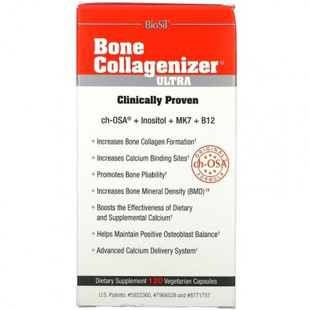 Решающая роль коллагена в общем состоянии костейНациональный институт здоровья сообщает, что для создания крепких здоровых костей необходимы кальций и коллаген. Кость на 30% состоит из коллагена. Коллаген служит центром связывания кальция и придает костям гибкость, которая позволяет им выдержать физические нагрузки. Вызванное возрастом сокращение коллагена приводит к ломкости костей и снижению МПК. Ch-OSA® в препарате Collagenizer® ULTRA увеличивает образование костного коллагена и МПК. Холин и инозитол поддерживают остеобаланс, обеспечивая надлежащее обновление костей. MK-7 обеспечивает доставку кальция к костной ткани. Витамин B12 и холин предотвращают распад коллагена?.Недостаточное количество костного коллагена приводит к недостаточному количеству центров связывания кальция, хрупкости костей с низкой МПК и «дырам» в костях (остеопороз).Оптимальный уровень костного коллагена способствует оптимальному количеству центров связывания кальция, оптимальной МПК, прочным, гибким костям, которые гнутся, а не ломаются.? Замеряется в бедреIsura™.Без ГМО: подтверждено документально ?Продукт прошел масс-спектрометрию: продукт прошел лабораторные испытания ?