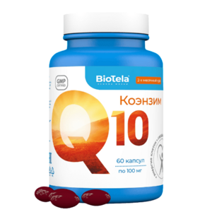 Молодость и здоровье вашего организма на клеточном уровнеЕжедневный прием «Коэнзим Q10 Biotela» поможет восполнить недостаток столь необходимого вещества и сохранить молодость и здоровье надолго!Что такоеКоэнзим Q10?«Коэнзим Q10 Biotela» стимулирует процессы защиты, заложенные самой природой!Коэнзим Q10 синтезируется нашим организмом самостоятельно и присутствует в каждой клетке. Однако с возрастом, а также в результате воздействия плохой экологии, стресса, нерационального питания и вредных привычек его концентрация заметно снижается. Это ослабляет способность нашего организма к регенерации, снижает иммунитет и способствует развитию самых разнообразных заболеваний.Ежедневный прием «Коэнзим Q10 Biotela» поможет восполнить недостаток столь необходимого вещества и сохранить молодость и здоровье надолго!Защитное действиеКоэнзим Q10 является непосредственным участником энергетического обмена, а еще он защищает клетки изнутри от так называемых свободных радикалов – активных веществ, которые провоцируют агрессивные химические реакции и могут разрушать клетки и их компоненты.По результатам исследований, повреждение свободными радикалами внутриклеточных структур и, тем более, ДНК, является одной из причин, которая может спровоцировать развитие онкологических заболеваний. Коэнзим Q10 нейтрализует свободные радикалы и оказывает антиоксидантное действие, то есть тормозит окислительные реакции, защищая ткани от разрушения.При этом естественный синтез коэнзима Q10 начинает снижаться после 25 лет, а качество и разнообразие нашего питания не всегда способны обеспечить его восполнение.Преимущества «Коэнзим Q10 BioTela»Только швейцарские компоненты. Качество – 100%. Мы ответственно относимся к производству наших продуктов, а потому используем для выпуска «Коэнзим Q10 Biotela» только швейцарские компоненты максимальной чистоты.Повышенная усвояемость. Усвоение коэнзима Q10 увеличивается при употребление его с жирами, поэтому мы добавили в наш препарат высококачественное оливковое маслоИдеальный баланс. Дневная норма, определенная Минздравом РФ, составляет 100 мг в день. Исходя из этого, мы используем экономичную упаковку, рассчитанную на курсовой 30-ти дневный прием.Изученность, безопасностьМедицинские исследования воздействия коэнзима Q10 на организм человека ведутся с середины XX века. В 1960-х в Японии отмечен первый удачный опыт применения вещества в лечении хронической сердечной недостаточности. С тех пор, особенно в последнее десятилетие, с каждым годом становится все больше описанных медицинских ситуаций, при которых применение коэнзима Q10 было признано удачным дополнением к стандартной терапии, улучшающим как клинические, так и субъективные показатели самочувствия больных.Более того, исследования механизмов клеточной энергетики, в которых участвует коэнзим Q10, были удостоены Нобелевской премии по химии в 1978 году. Таким образом, уровень изученности вещества и механизма его действия делает коэнзим Q10 одной из наиболее эффективных и безопасных пищевых добавок в мире.Помощь при заболеванияхБолезни сердечно-сосудистой системыМаксимальная концентрация коэнзима Q10 наблюдается в сердце. Это объясняется высокими энергетическими потребностями органа и делает его особенно чувствительным к нехватке необходимых веществ. А ведь именно бо