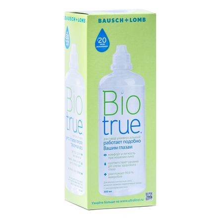 Для кондиционирования, очистки, удаления протеиновых отложений, промывания, дезинфекции и хранения мягких контактных линз (гидрогелевых, силикон-гидрогелевых). Раствор Biotrue® предназначен для очистки, дезинфекции, увлажнения и хранения контактных линз, как гидрогелевых, так и силикон-гидрогелевых. • Универсальный раствор Biotrue® работает подобно вашим глазам¹ ² ³ • Универсальный раствор Biotrue® вдохновленный биологией ваших глаз¹ • Универсальный раствор Biotrue® обеспечивает комфортное ношение контактных линз в течение всего дня¹ • Универсальный раствор Biotrue® (Биотру) содержит смазывающее вещество, входящее в состав биологической ткани Ваших глаз и сбалансирован до соответствия pH слезы здорового глаза.¹ • Уменьшает сухость и дискомфорт при ношении линз (увлажнение контактных линз до 20 часов)⁴ • Обеспечивает увлажнение с помощью естественного полимера – гиалуронана¹ Ссылки: 1. Инструкция к раствору Biotrue®. 2. Бурке С. Е., Фридман К. М., Шеуер С.А., Барниак В. Л. Физические свойства многоцелевых растворов для ухода за контактными линзами. Рочестер. Нью-Йорк. 2010. 3. Кавет М. Е. и др. Эффект нового многоцелевого раствора для ухода за контактными линзами на барьерную функцию эпителия роговицы человека //Контактные линзы и передний отрезок глаза (Великобритания). – 2010. – Т. 33. – С. S18-S23.). 4. Шейер К. А. и др. Сохранение увлажняющего агента гиалуронана на гидрогелевых контактных линзах //Контактные линзы и передний отрезок глаза (Великобритания). – 2010. – Т. 33. – С. S2-S6