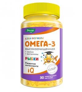Бэби Формула Мишки Омега-3Вкусная мармеладная омега-з для развития детского интеллекта. Детям с 3 лет.Активное вещество: омега-3 (ДГК), холин, витамин В6, витамин В12, витамин С.Действие: развитие интеллекта, памяти и внимания.Для того, чтобы ребенку легко давалась учеба – чтение, письмо, новые знания – его питание должно быть качественным и разнообразным, включающим достаточное количество полиненасыщенных жирных кислот омега-3, а также других полезных для развития мозга элементов.Фармацевтическая компания «Эвалар» представляет современный комплекс для развития интеллекта, памяти и внимания ребенка в виде вкусных мармеладных мишек «Бэби Формула Мишки Омега-3».Комплекс подходит для детей с трехлетнего возраста, школьников младших, средних и старших классов.В состав этого комплекса входит высокоочищенная омега-3 (докозагексаеновая кислота (ДГК)) из экологически чистых микроводорослей от испанской компании SOLUTEX. Микроводоросли лишены аллергенных свойств, присущих рыбе1, и содержат омегу-3 в высокоусвояемой2 триглицеридной форме, более родственной организму.Помимо омега-3 комплекс содержит витамины для мозга – В6, В12, С, а также холин – в эффективных высоких дозировках.Благодаря усиленному составу «Мишки Эвалар Омега-3» способствуют: Восполнению дефицита омега-3 (ДГК) Улучшению работы мозга Развитию интеллекта, памяти и внимания Повышению способности к обучению Поддержанию нервной системы Формированию и поддержке хорошего зренияА яркий фруктовый вкус и натуральный аромат сделают эти пастилки приятным лакомством для вашего ребенка.Преимущества: Качественный состав: высокоочищенная омега европейского качества, полученная из микроводорослей (компания SOLUTEX, Испания) Экологически чистое сырье Высокая степень усвояемости за счет триглицеридной формы докозагексаеновой кислоты, которая является природной и более родственной организму ребенка Микроводоросли лишены аллергенных свойств, присущих рыбе1 Усиленный состав – помимо омега-3 комплекс содержит витамины для мозга – В6, В12, С, а также холин – в эффективных высоких дозировках Доступная цена3 Яркий фруктовый вкус и приятный натуральный аромат Без глютена и ГМО Без искусственных красителей, ароматизаторов и консервантов Специальная крышка с защитой от вскрытия детьми