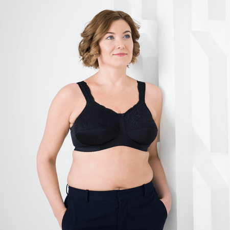 Этот бюстгальтер из благородного эластичного кружева с цветочными мотивами существует в двух вариантах: черного цвета с бордовыми узорами или полностью белый. Чашка, состоящая из трех частей, гарантирует оптимальную поддержку и комфорт благодаря усиленному поддерживающему эффекту в районе груди даже при больших ее размерах. Этот бюстгальтер оснащен двумя плотно прилегающими прозрачными кармашками телесного цвета, вплетенными в структуру кружева, что придает данной модели естественный и элегантный вид. Широкие, мягкие и разгружающие бретели предотвращают их врезание в плечо и равномерно распределяют вес экзопротеза. Изделие медицинского назначения обмену и возврату не подлежит.
