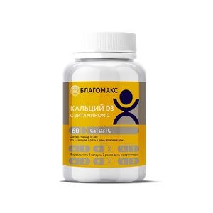 Биологически активная добавка к пище Благомакс Кальций D3 с витамином С рекомендуется в качестве дополнительного источника кальция, витаминов D3 и С.Кальций является основным компонентом костей и зубов. Кроме этого он регулирует работу нервной системы, участвует в свертывании крови, способствует правильному формированию мышечной системы.Витамин D3 увеличивает всасывание кальция в тонком кишечнике. Поскольку витамин D регулирует процесс усвоения кальция и фосфора, он играет ключевую роль в нормальном формировании костей и зубов.Витамин С или аскорбиновая кислота — является одним из основных питательных веществ в человеческом рационе, которое необходимо для нормального функционирования соединительной и костной ткани. Выполняет биологические функции восстановителя и кофермента некоторых метаболических процессов, является антиоксидантом. Витамин С необходим организму для синтеза стероидных гормонов, нейромедиаторов, коллагена и карнитина, всасывания железа, стимуляции макрофагов, индукции эндогенного интерферона, превращения фолиевой кислоты в ее активную форму. Значение витамина С в жизнедеятельности человека огромно. Он помогает справляться с простудными заболеваниями, стимулирует иммунитет, укрепляет стенки сосудов.