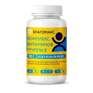 Благомакс Комплекс витаминов группы В рекомендуется в качестве биологически активной добавки к пище – дополнительного источника витаминов В2, В3, В5, В6, В9, В12, источника инозита.Витамин В2 — рибофлавин играет важную роль в углеводном, белковом и жировом обмене, в поддержании нормальной зрительной функции глаза (входит в состав зрительного пурпура и защищает сетчатку от вредного воздействия УФ-излучения).Витамин В3 — регулирует окислительно-восстановительные процессы, тканевое дыхание, синтез белков и жиров, распад гликогена. Нормализует липидный состав крови. Оказывает сосудорасширяющее действие, в том числе на сосуды головного мозга, улучшает микроциркуляцию, повышает фибринолитическую активность крови и уменьшает агрегацию тромбоцитов. Обладает дезинтоксикационными свойствами.Витамин В5 — необходим для обмена жиров, углеводов, аминокислот, синтеза жизненно важных жирных кислот, холестерина, гистамина, ацетилхолина, гемоглобина.Витамин В6 — играет важную роль в обмене веществ, необходим для нормального функционирования центральной и периферической нервной системы, участвует в синтезе нейромедиаторов, ферментов, гемоглобина, простогландинов, обмене серотонина, катехоламинов, глутаминовой кислоты, ГАМК, гистамина, улучшает использование ненасыщенных жирных кислот, снижает уровень холестерина и липидов в крови, улучшает сократимость миокарда, способствует превращению фолиевой кислоты в ее активную форму, стимулирует гемопоэз.Инозит (витамин В8) — участвует в регуляции жирового обмена, способствует снижению уровня холестерина в крови, препятствуя развитию атеросклероза и ожирению, улучшает текучесть крови (реологию) и препятствует образованию тромбов, а также способствует эластичности стенок артерий.Витамин В9 — принимает активное участие в процессах регуляции функций органов кроветворения, оказывает антианемическое воздействие при макроцитарной анемии. Также положительно влияет на функции кишечника и печени, повышает содержание холина в печени и препятствует ее жировой инфильтрации. Фолиевая кислота поддерживает иммунную систему, способствует нормальному образованию и функционированию белых кровяных телец.Витамин В12 (цианокобаламин) обеспечивает процессы кроветворения — синтез гемоглобина, а также участвует во многих других важнейших реакциях обмена веществ (в регуляции обмена аминокислот, стимулирует образование нуклеиновой кислоты РНК, принимающей участие в синтезе белка, сдерживает избыточное отложение жира в печени, способствует снижению уровня холестерина в крови и устранению его из кровеносных сосудов.